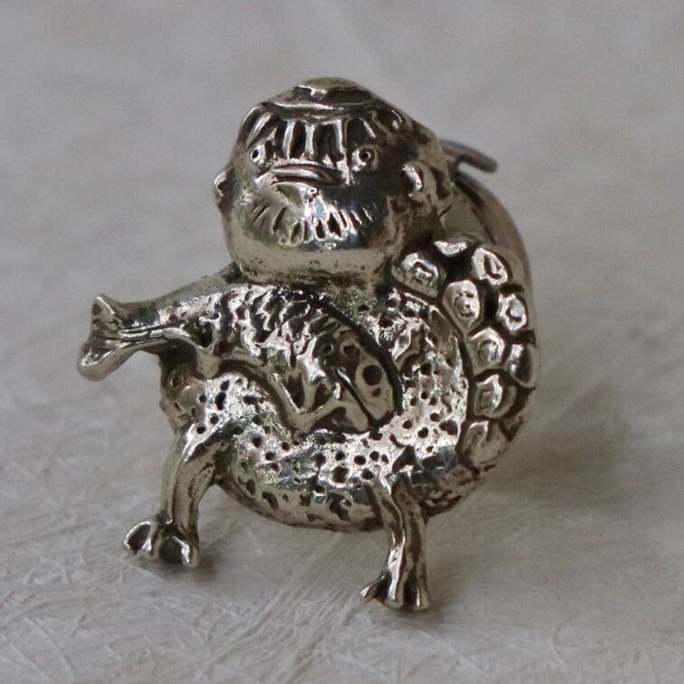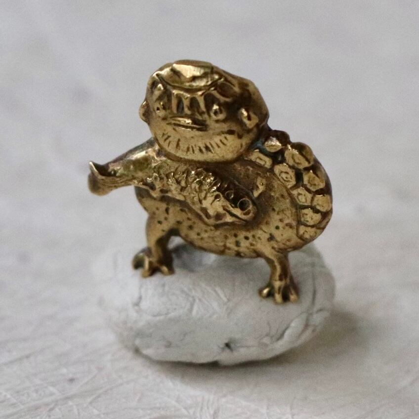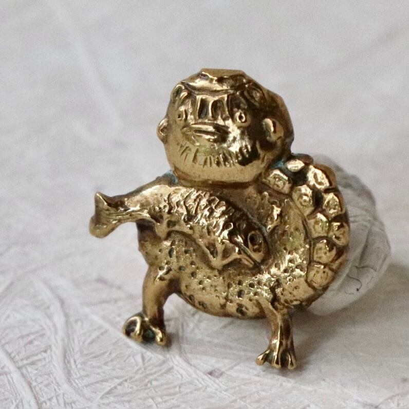 こちらの作品は〈妖怪シリーズ> のかっぱです。かわいいお顔したかっぱちゃん。くちばしとお手手と脚は鳥さん。背中には甲羅。大きな魚を抱えてにっこりとしています。頭のお皿には水が入っていないよ。