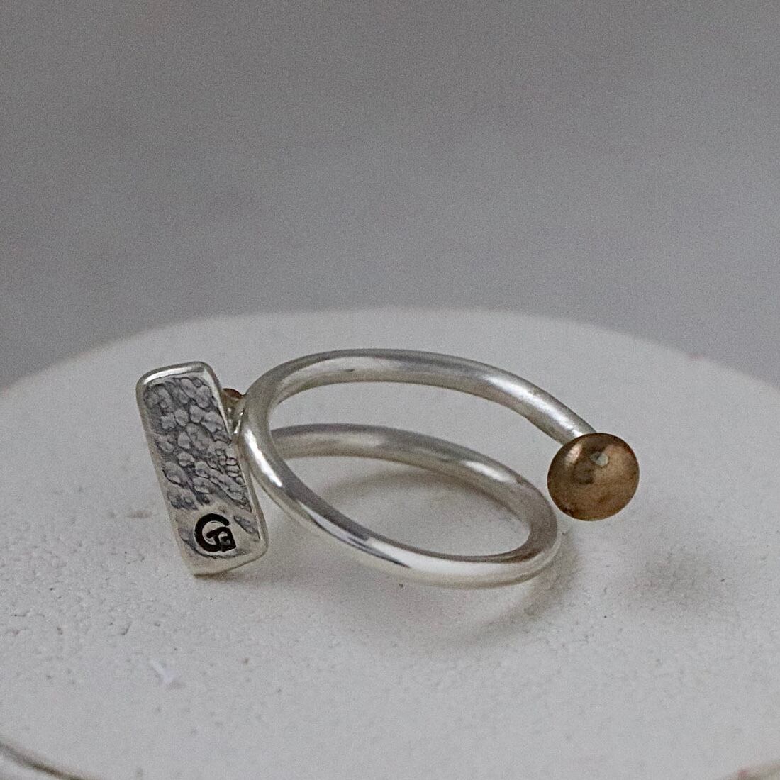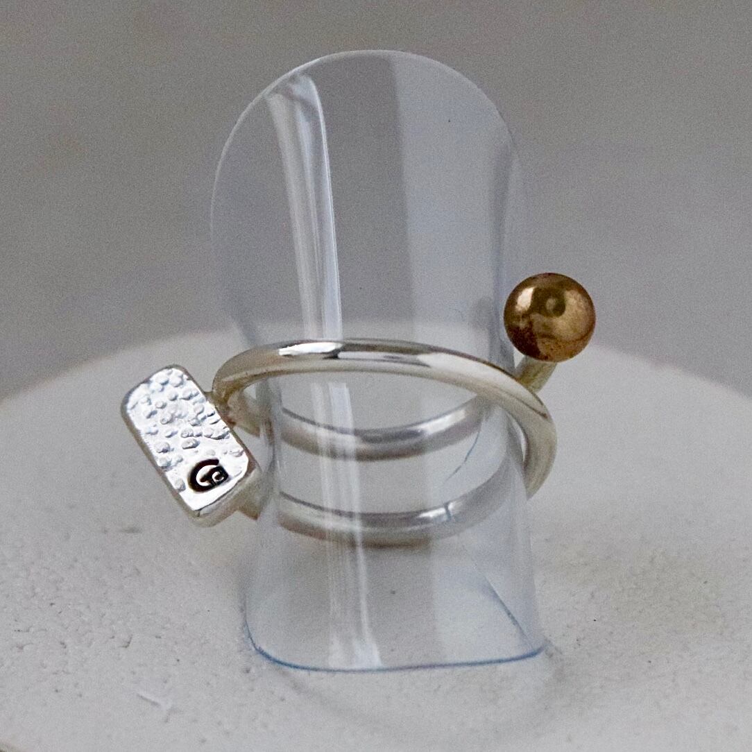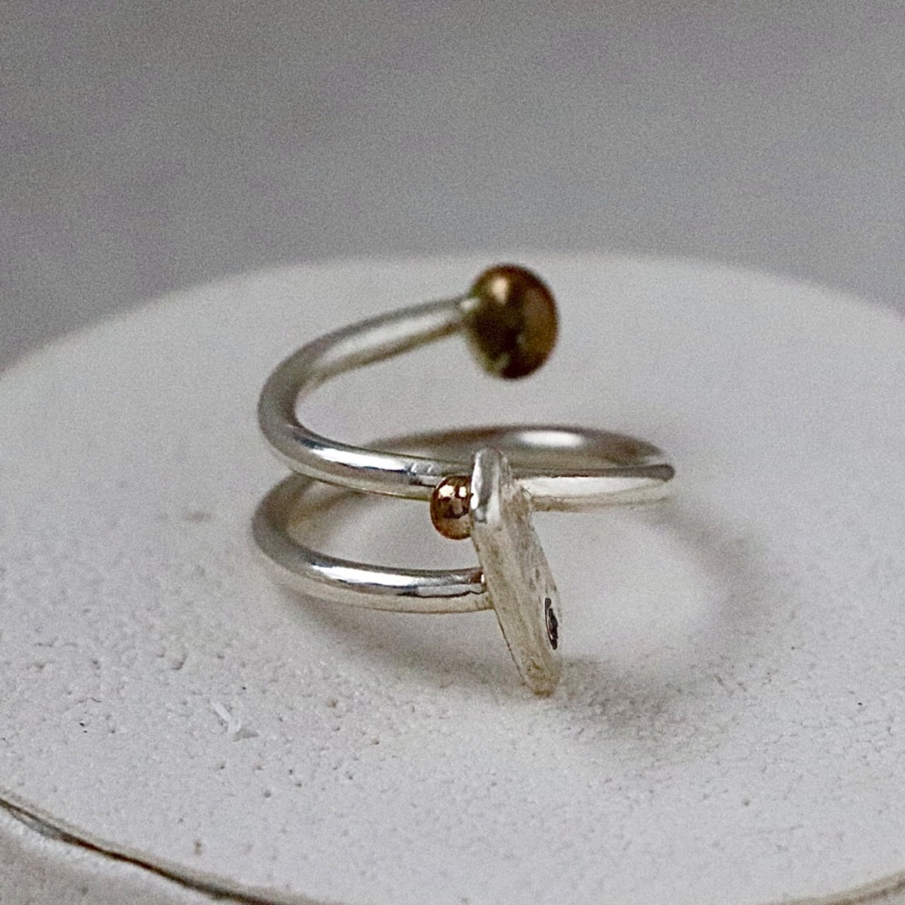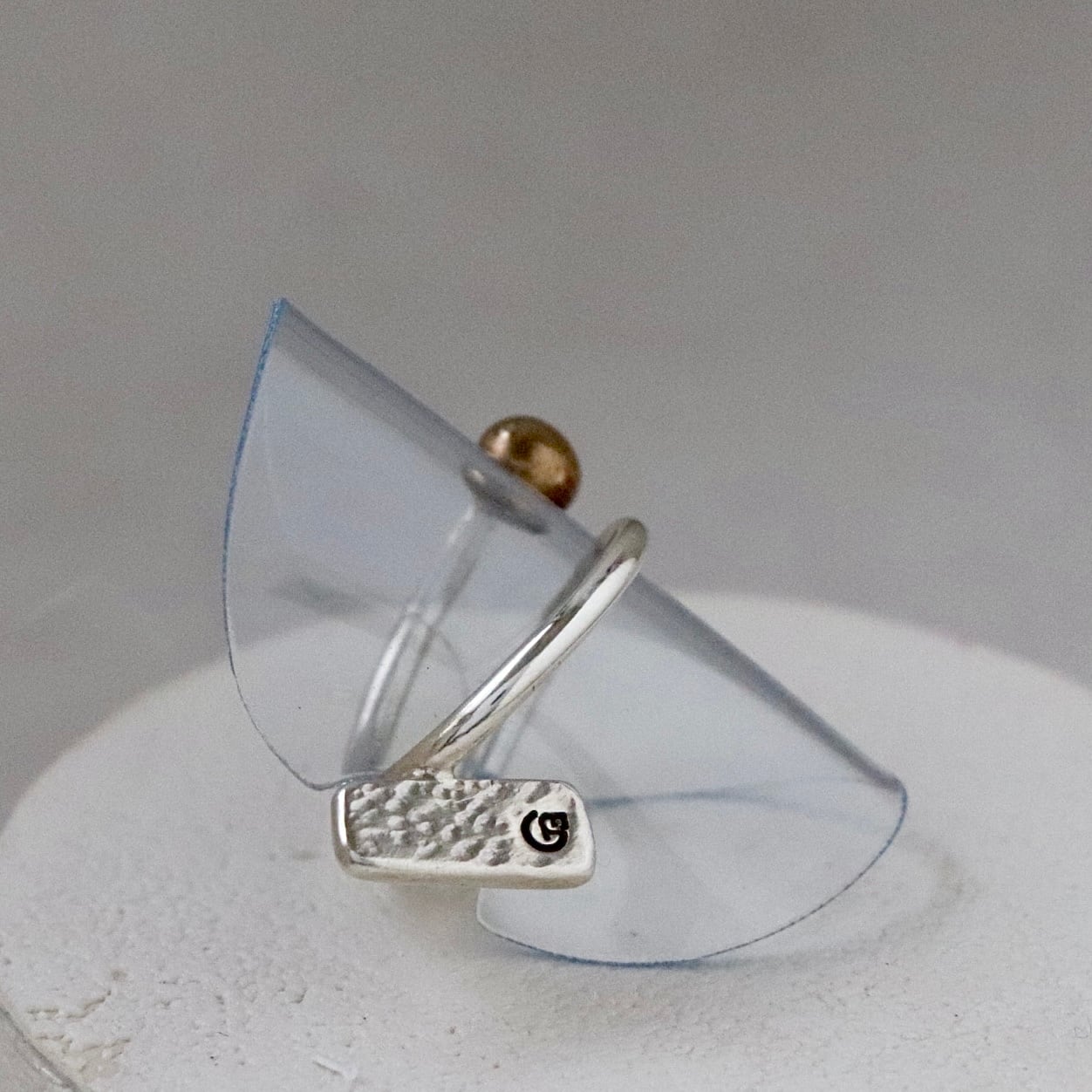 片端には温かみを放つゴールドの玉(エコブラス:鉛レス真鍮)、もう片端には静かな輝きを湛えたシルバーのプレート。