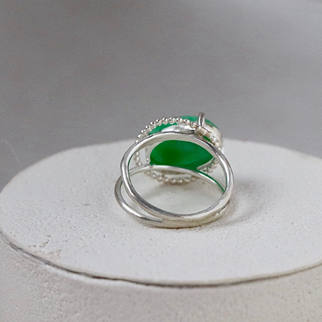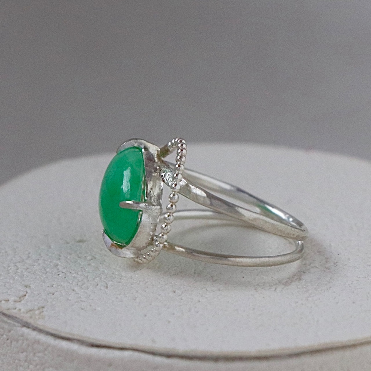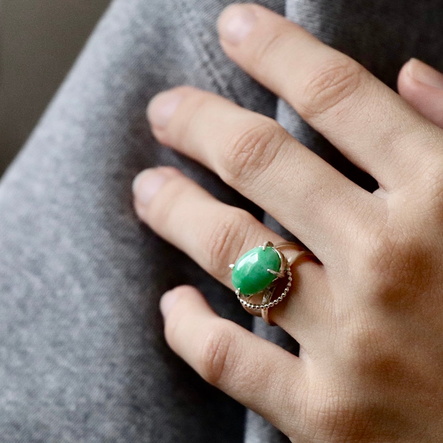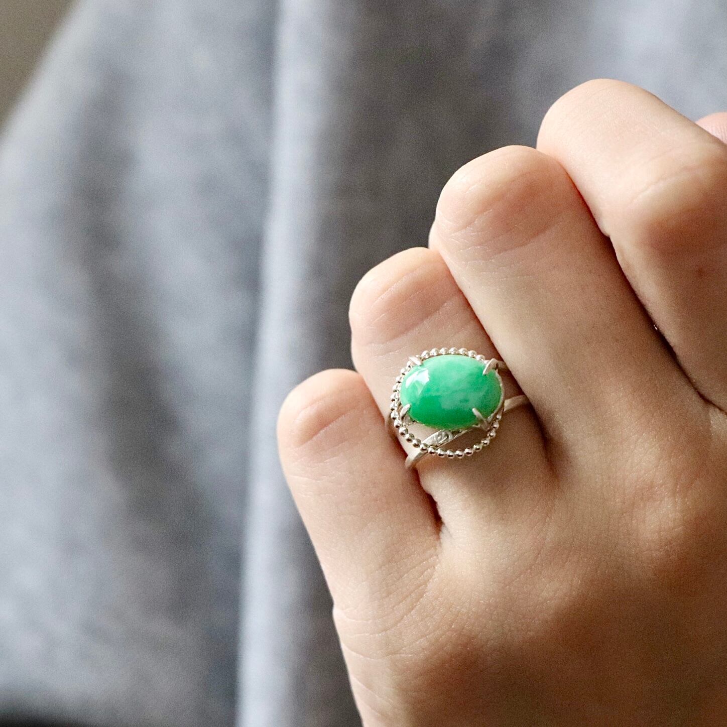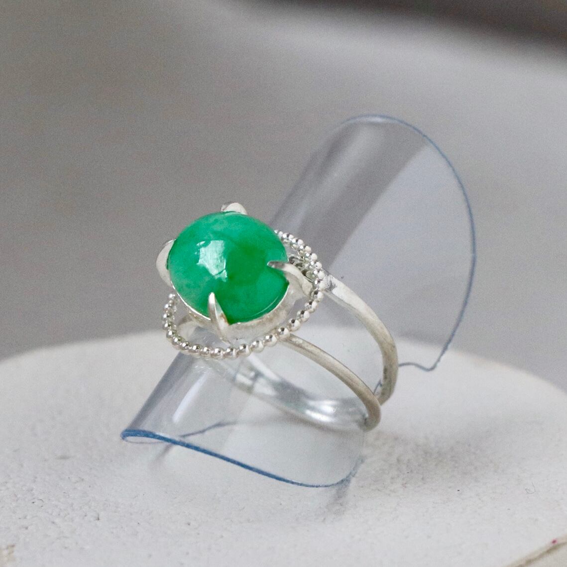 深い森の奥で見つけたような、澄んだグリーンの輝きを宿すジェダイト。