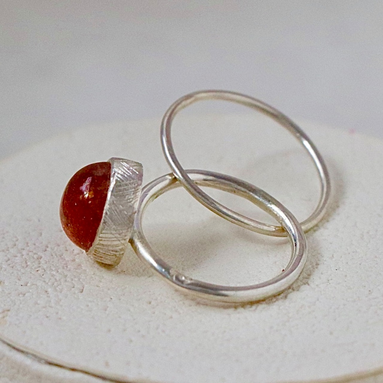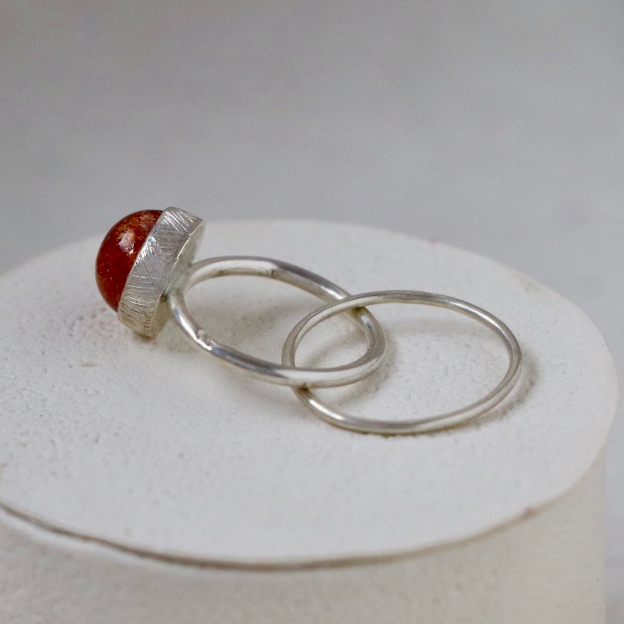 サンストーンの温もりある輝きと、遊び心のあるリンクデザインが融合した特別なリングです。