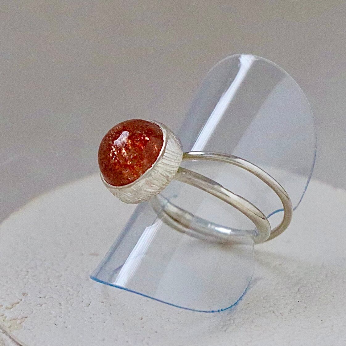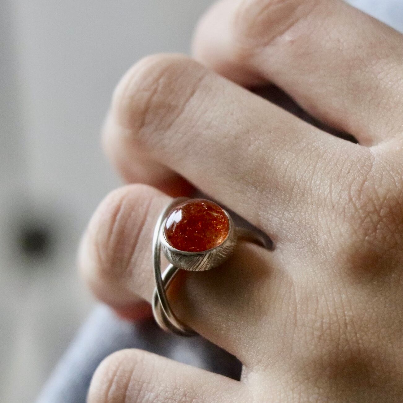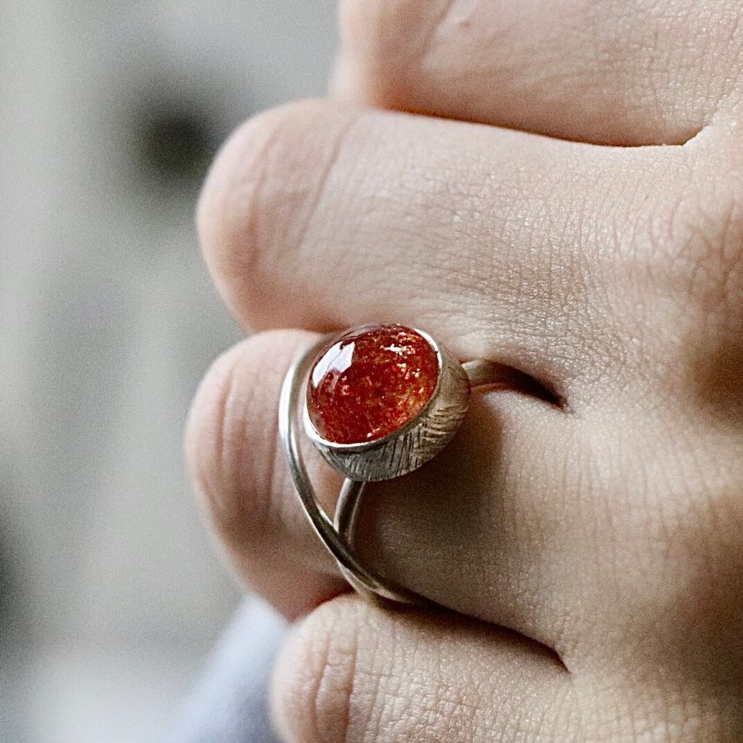 きらめく光を閉じ込めたようなサンストーンをあしらったリング。