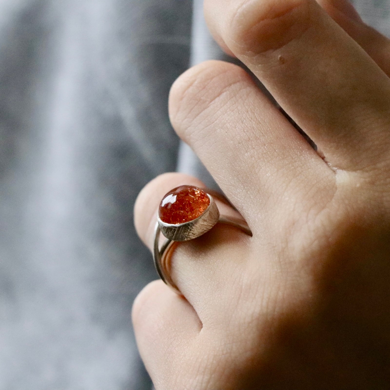 石の中に散りばめられたインクルージョンが太陽の光を映すように輝き、角度によって温かなオレンジの閃きを放ちます。