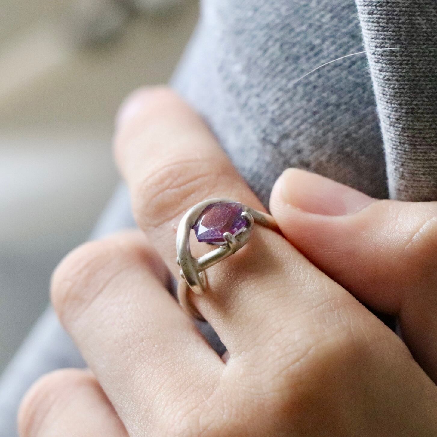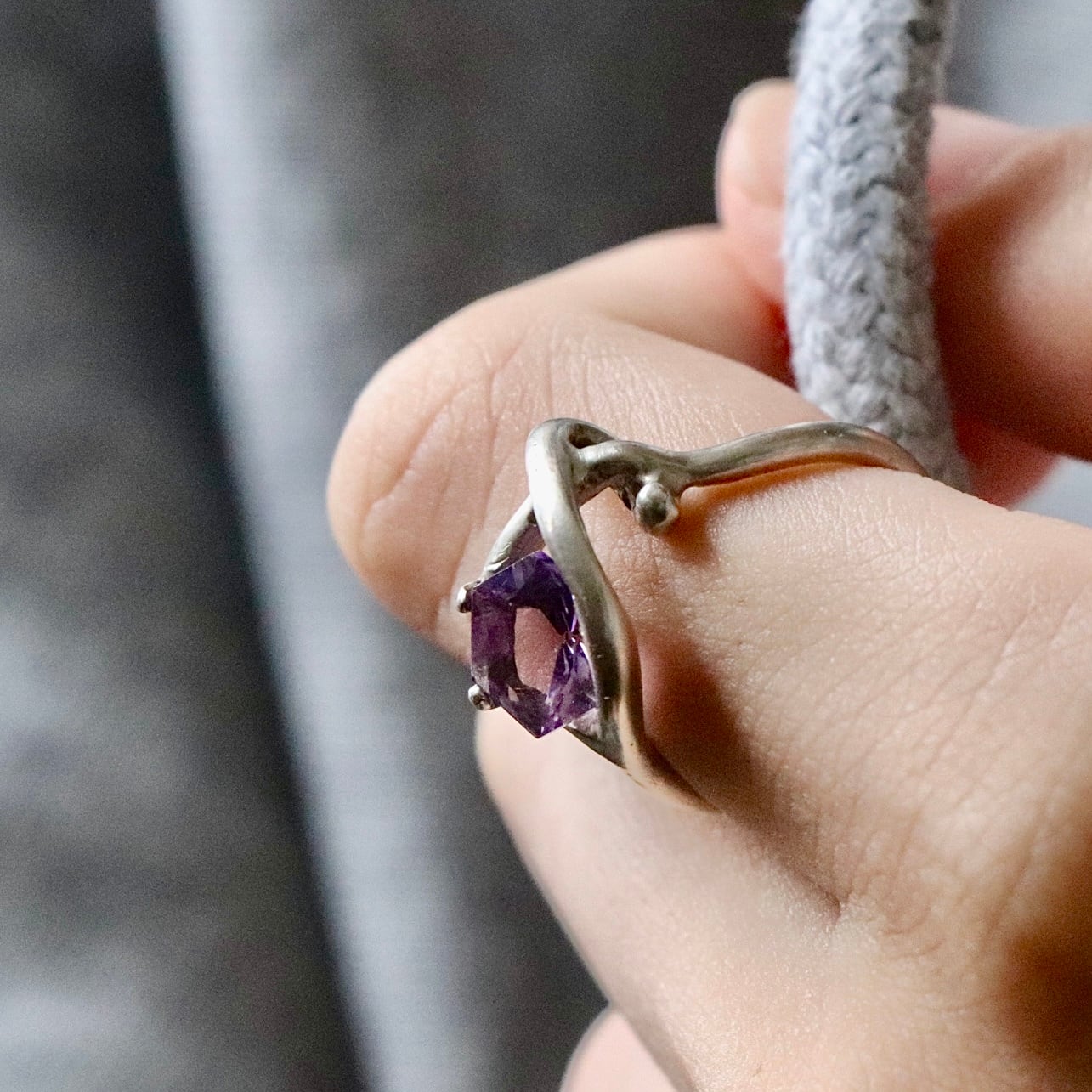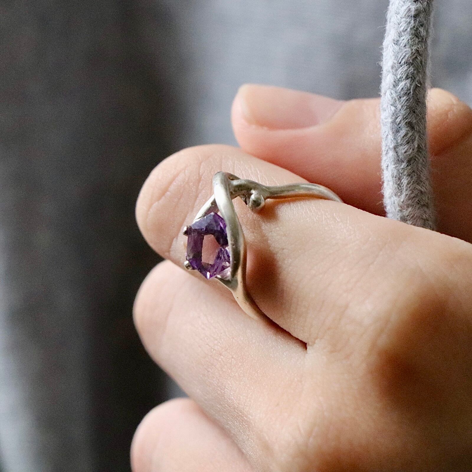 角度によって光を受けるアメジストの輝きが、指先で凛とした存在感を放ちます。