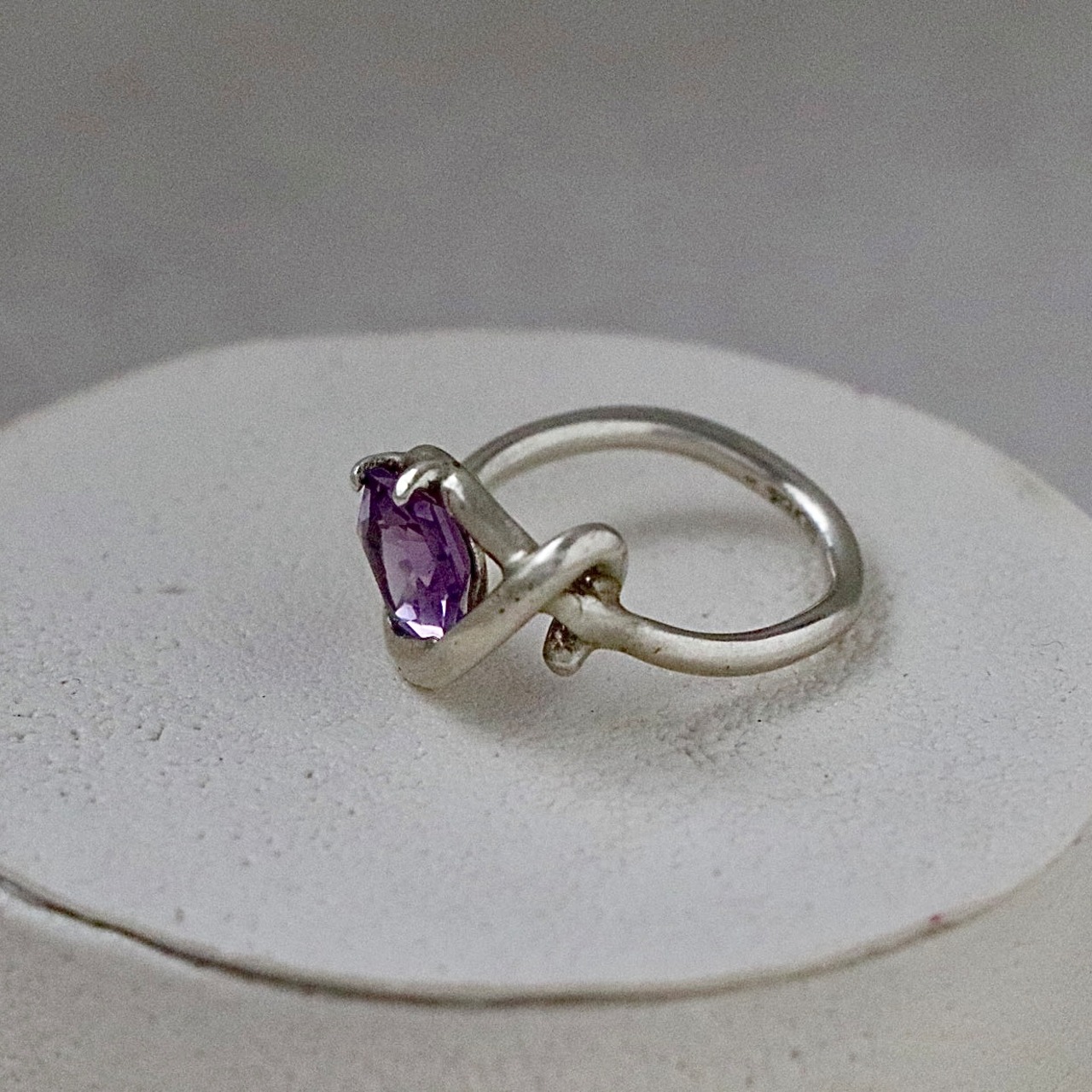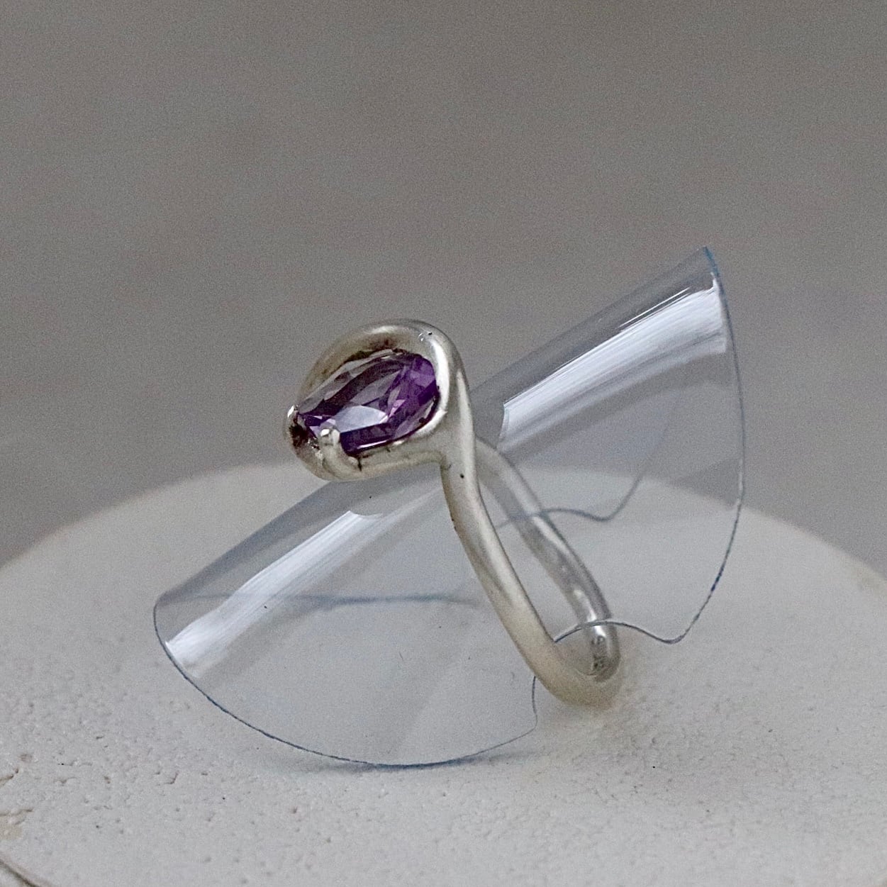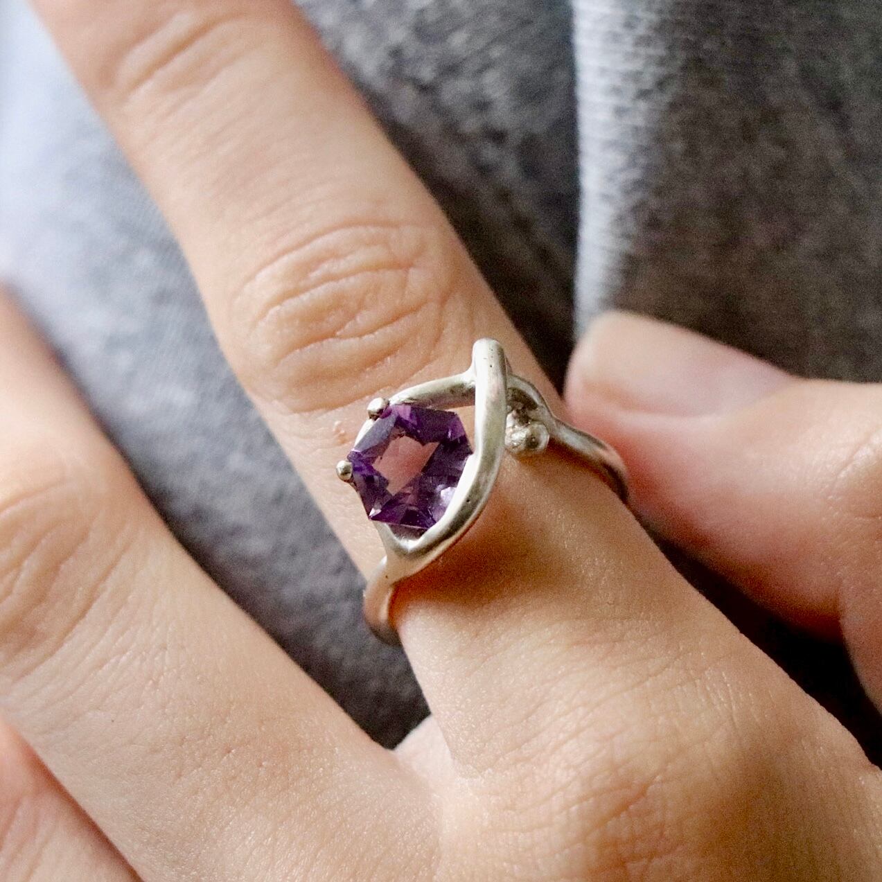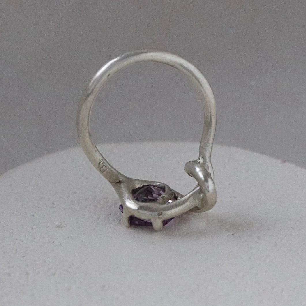 角度によって光を受けるアメジストの輝きが、指先で凛とした存在感を放ちます。