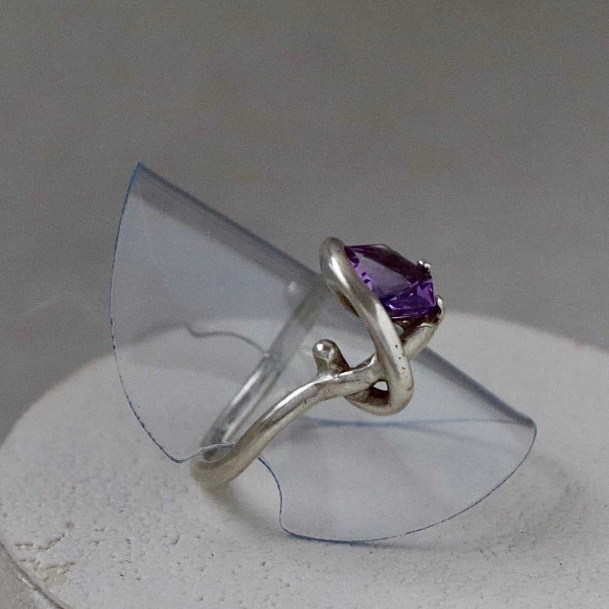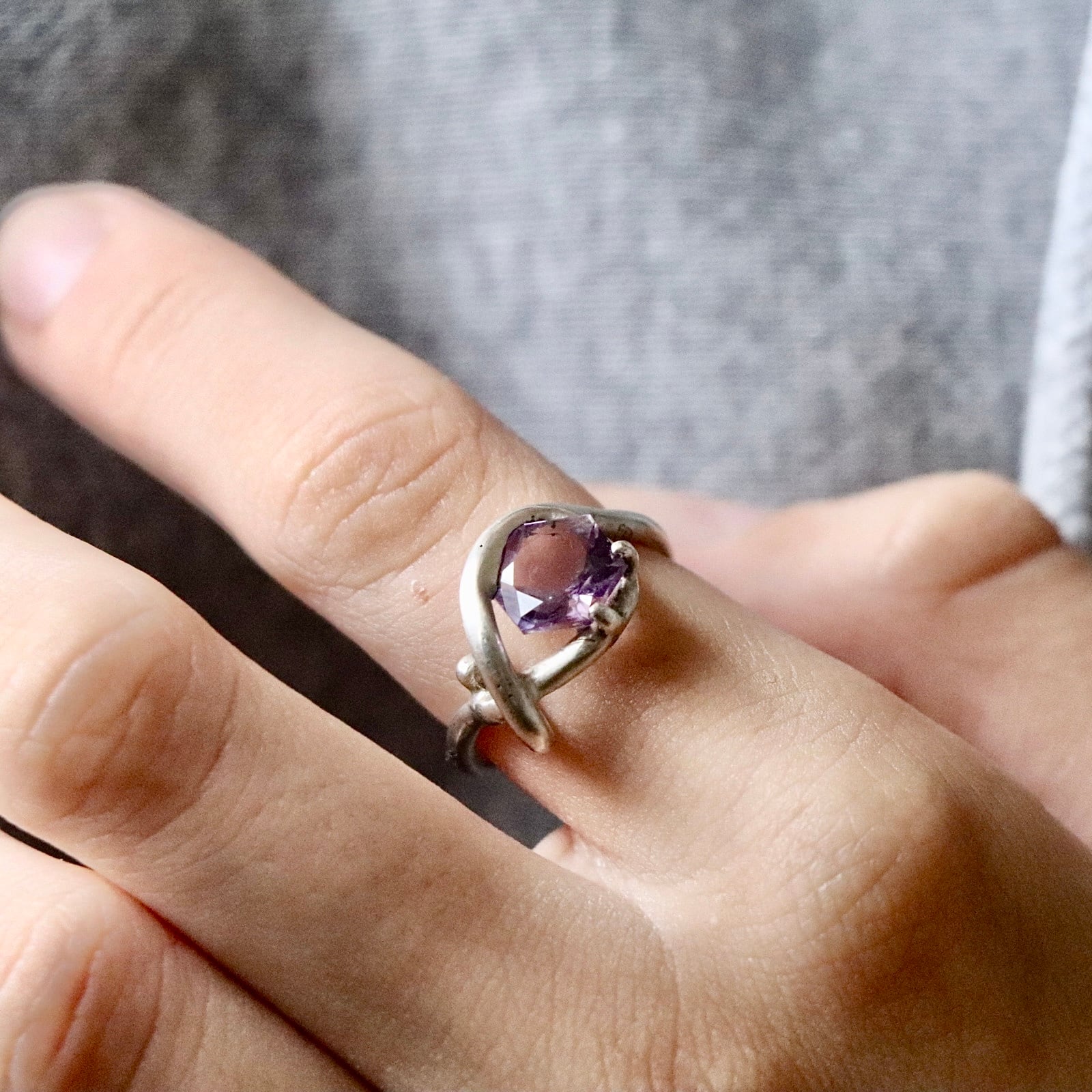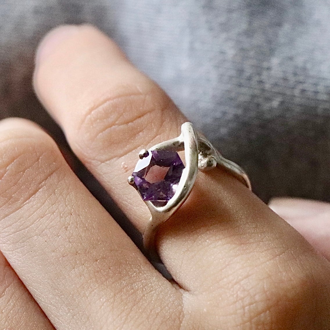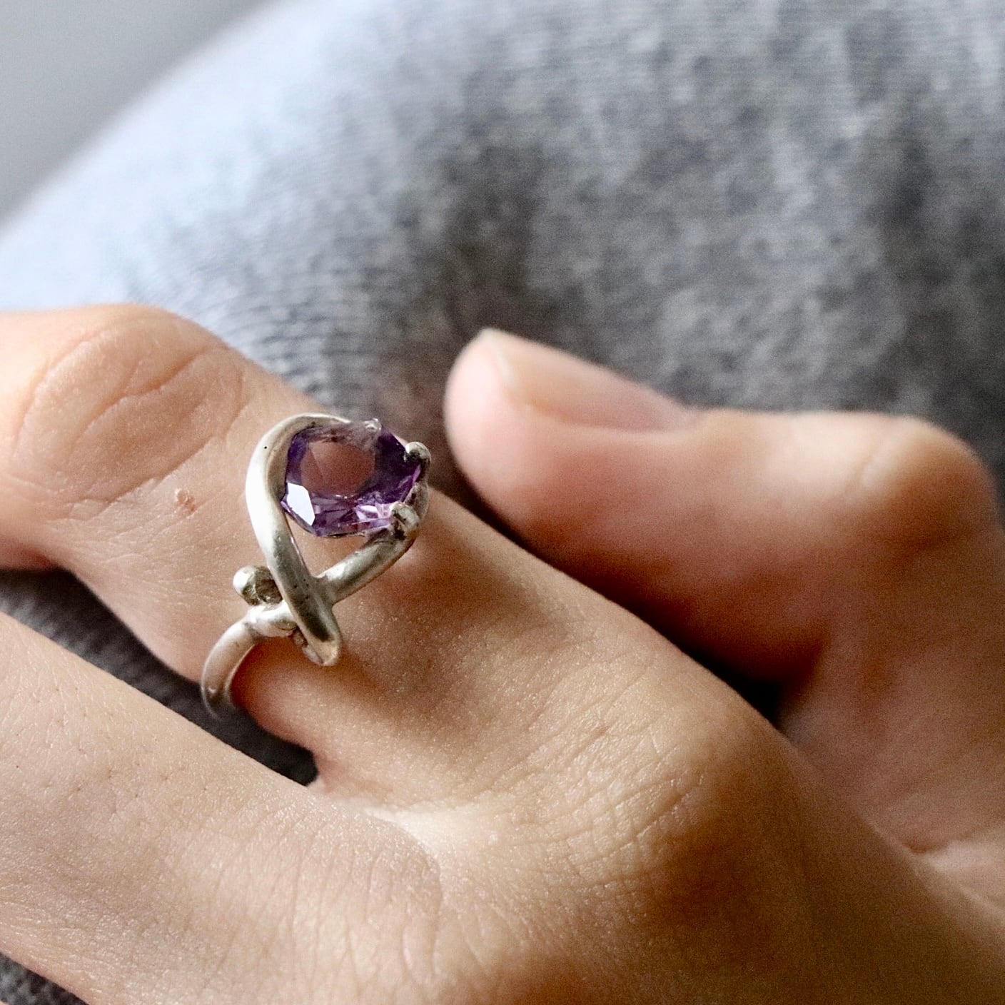 透明感のある紫色が美しいアメジストの六角形ルースを包み込んだデザインリング。