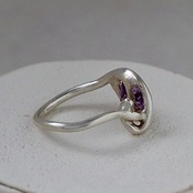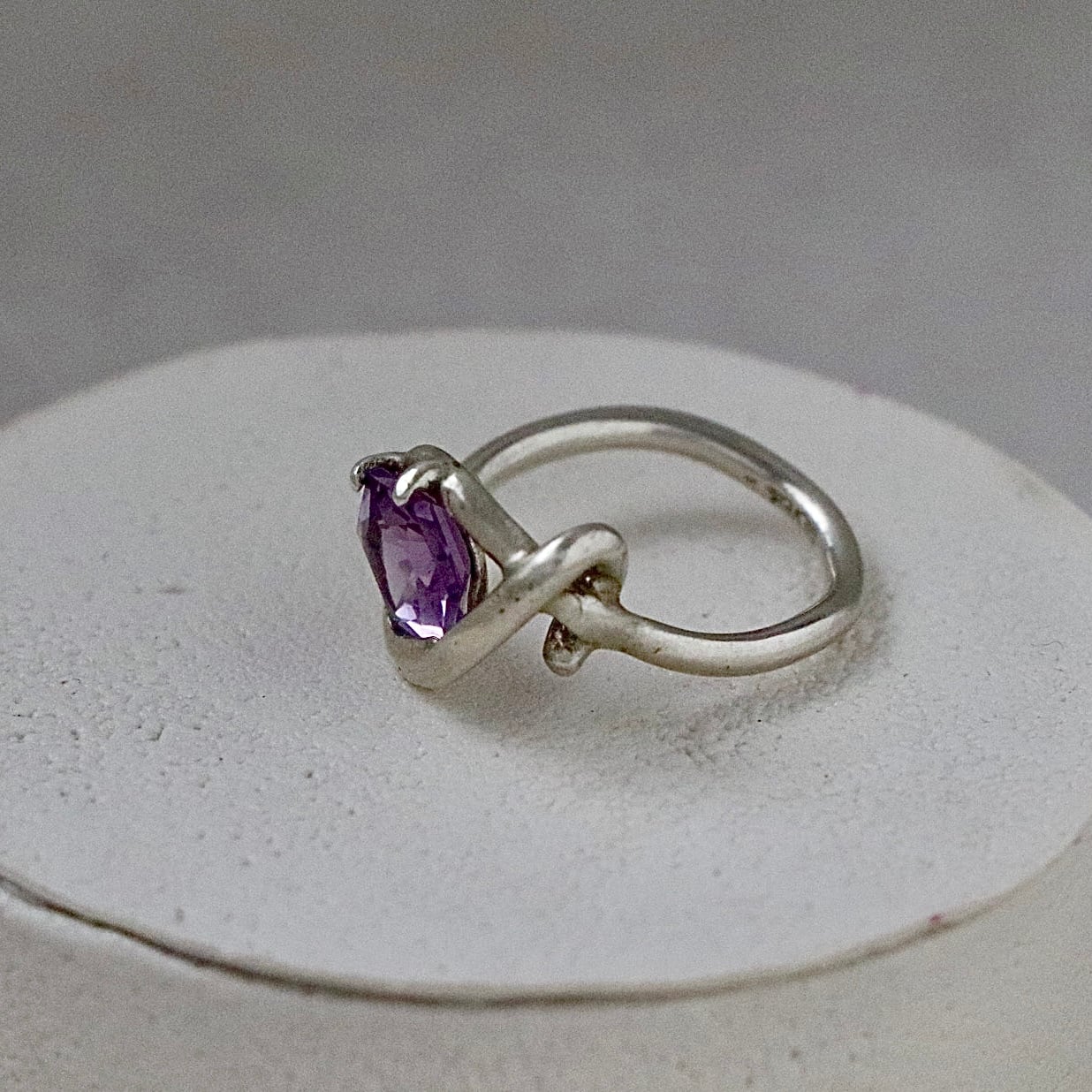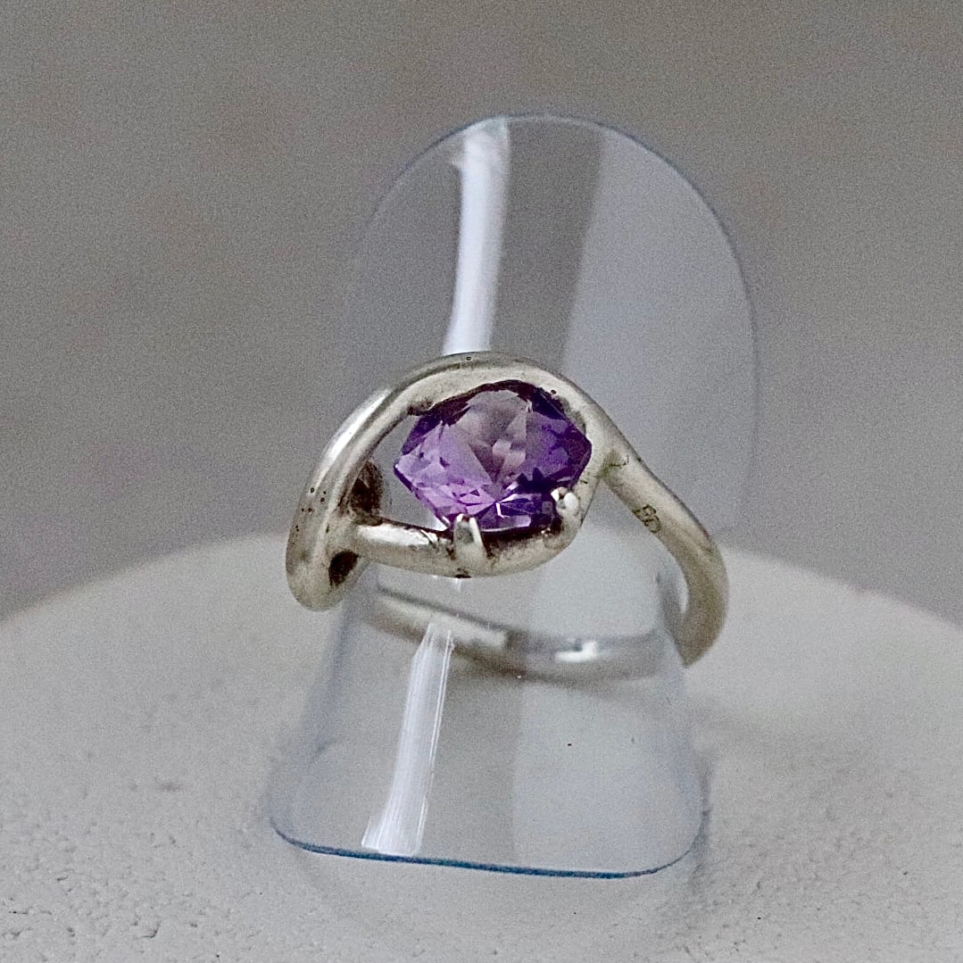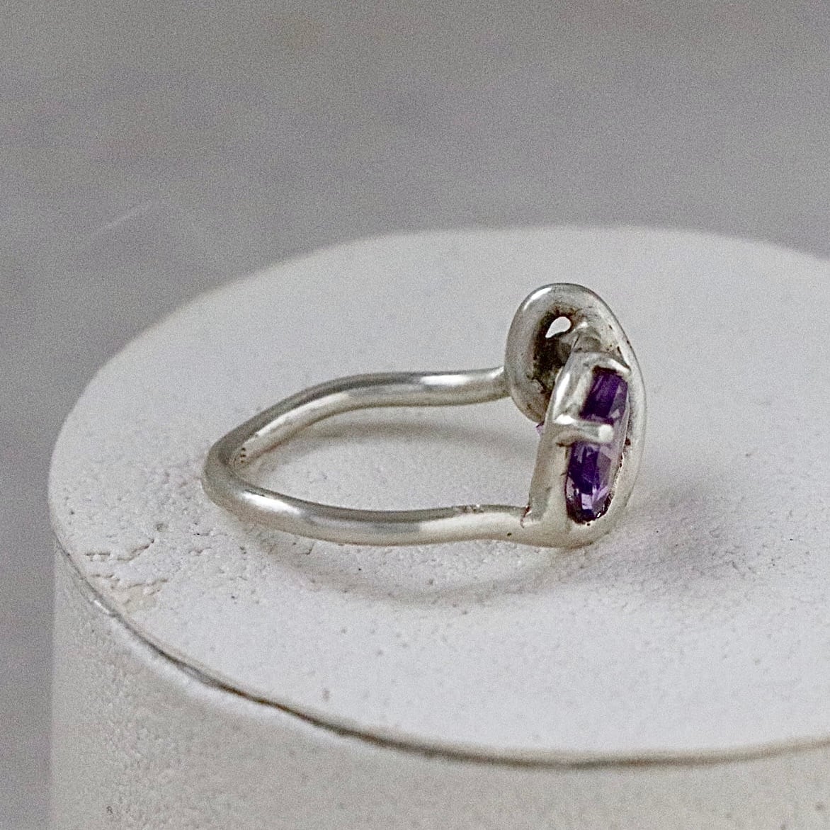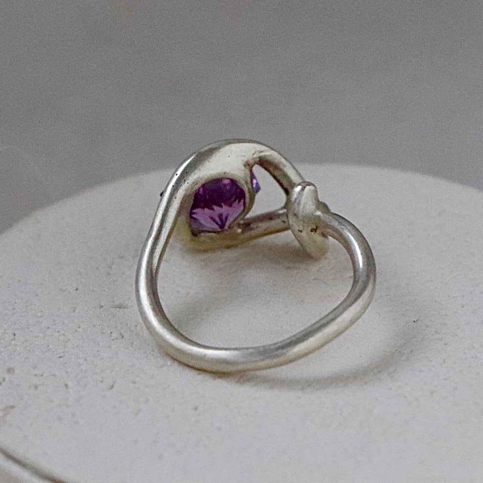 透明感のある紫色が美しいアメジストの六角形ルースを包み込んだデザインリング。