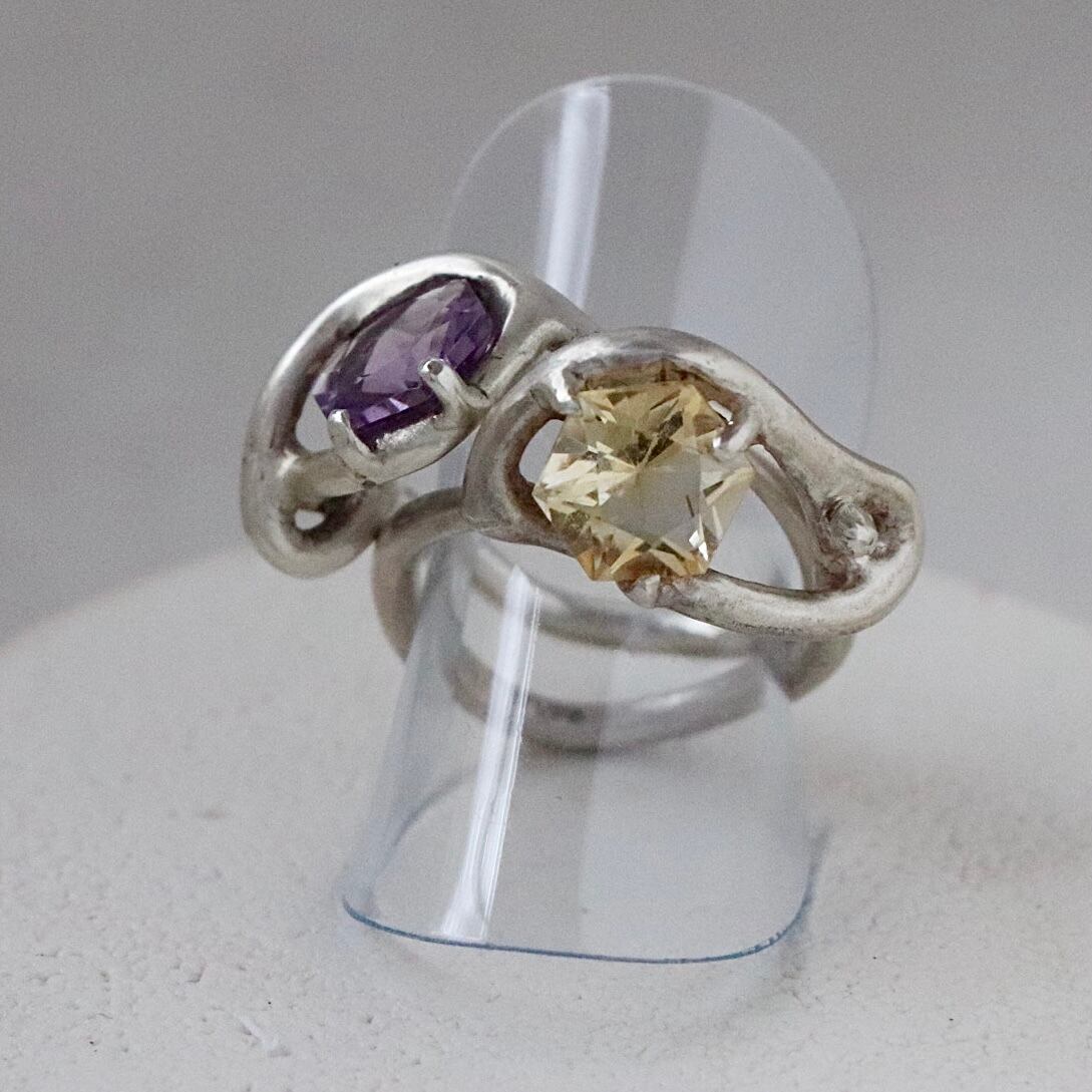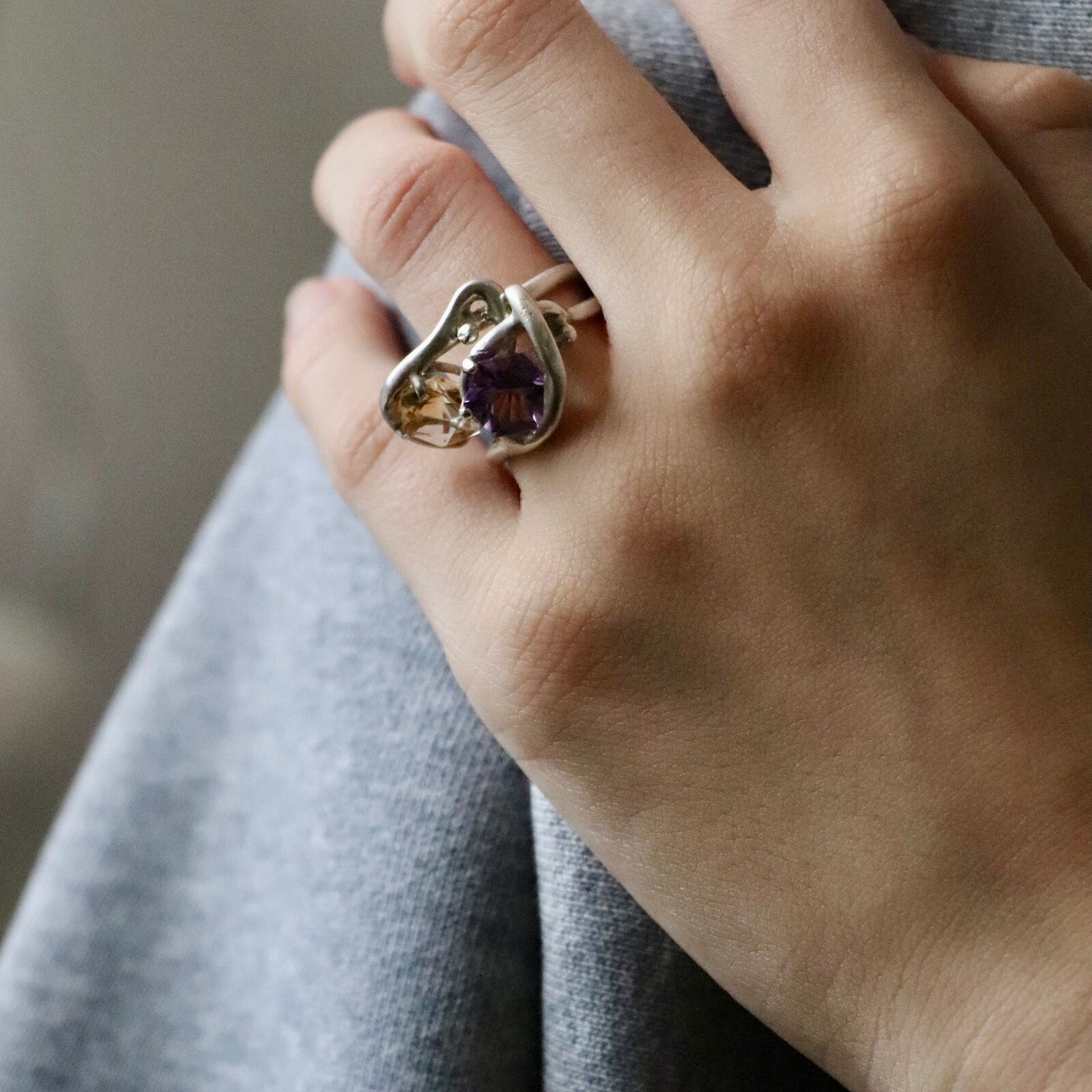 さらに、別売りの薄いイエローのトーンのシトリンリングと重ねてつけることで、紫と淡い黄のコントラストが際立ち、より洗練された力強さを演出。