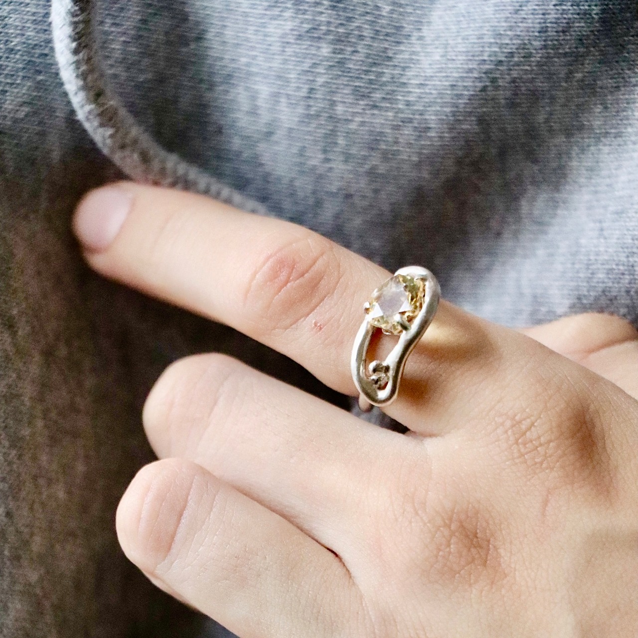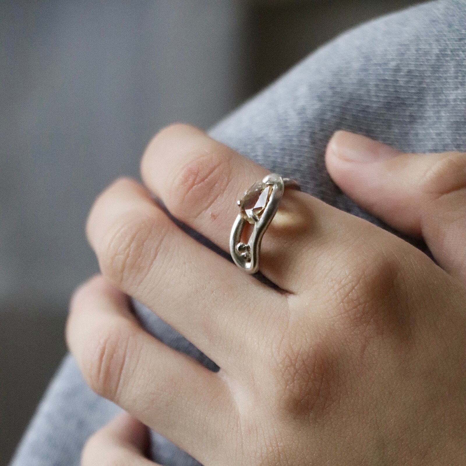 リングは上下どちらに付けるかで印象が変わるデザイン。指先での重なり方や角度によって、光の反射やシルエットが変化し、さりげない遊び心を演出します。