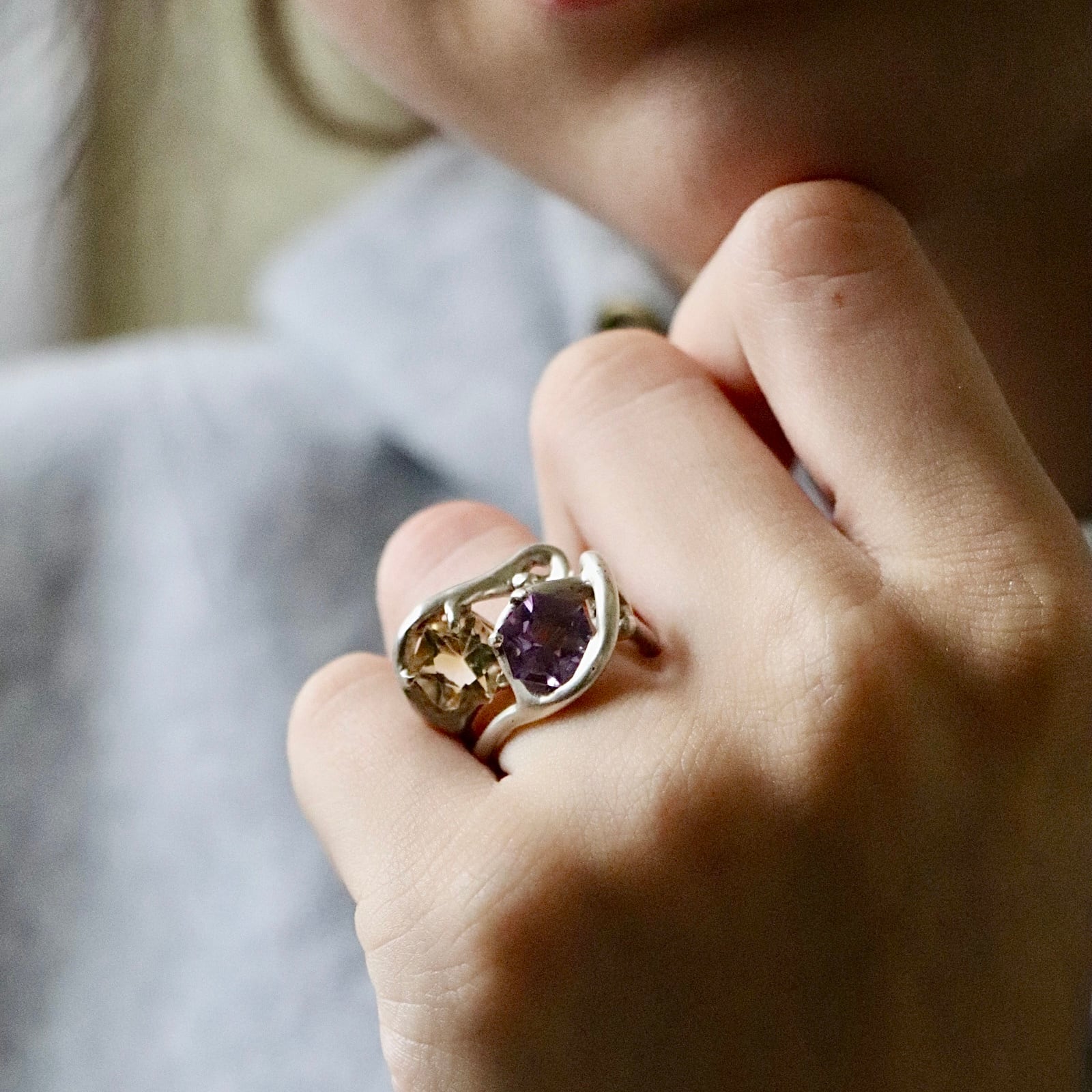また、別売りのアメジストリングと重ねづけすれば、紫と淡い黄のコントラストが際立ち、指先に洗練された存在感を加えることも可能です。