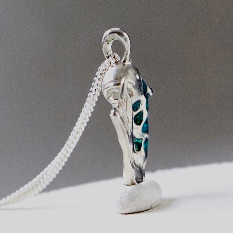 鱗にはブルーとグリーンに揺らめくオパールを丁寧に嵌め込み、まるで水面を泳ぐ鯉のように光を受けて輝きます。表も裏も楽しめる立体的な造形で、角度によって異なる表情を見せてくれます。
