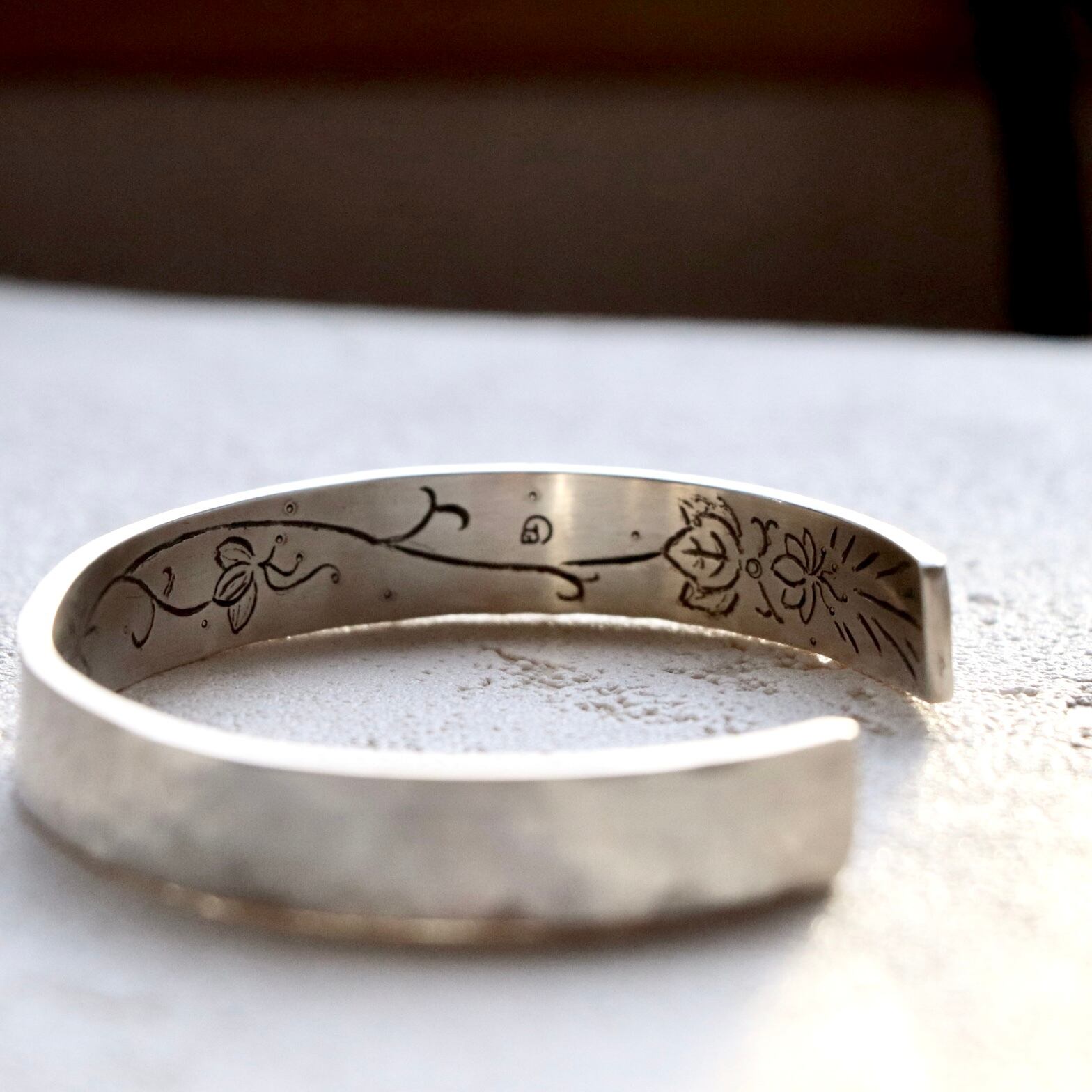 内側には、手彫りで彫り込んだ橘の花の隠し柄を。身につける人だけが知る、小さなこだわりを忍ばせました。