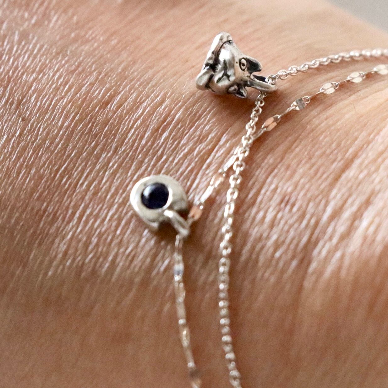 穏やかに箱座りする猫と、深いブルーバイオレットに輝くアイオライトが寄り添うブレスレット。