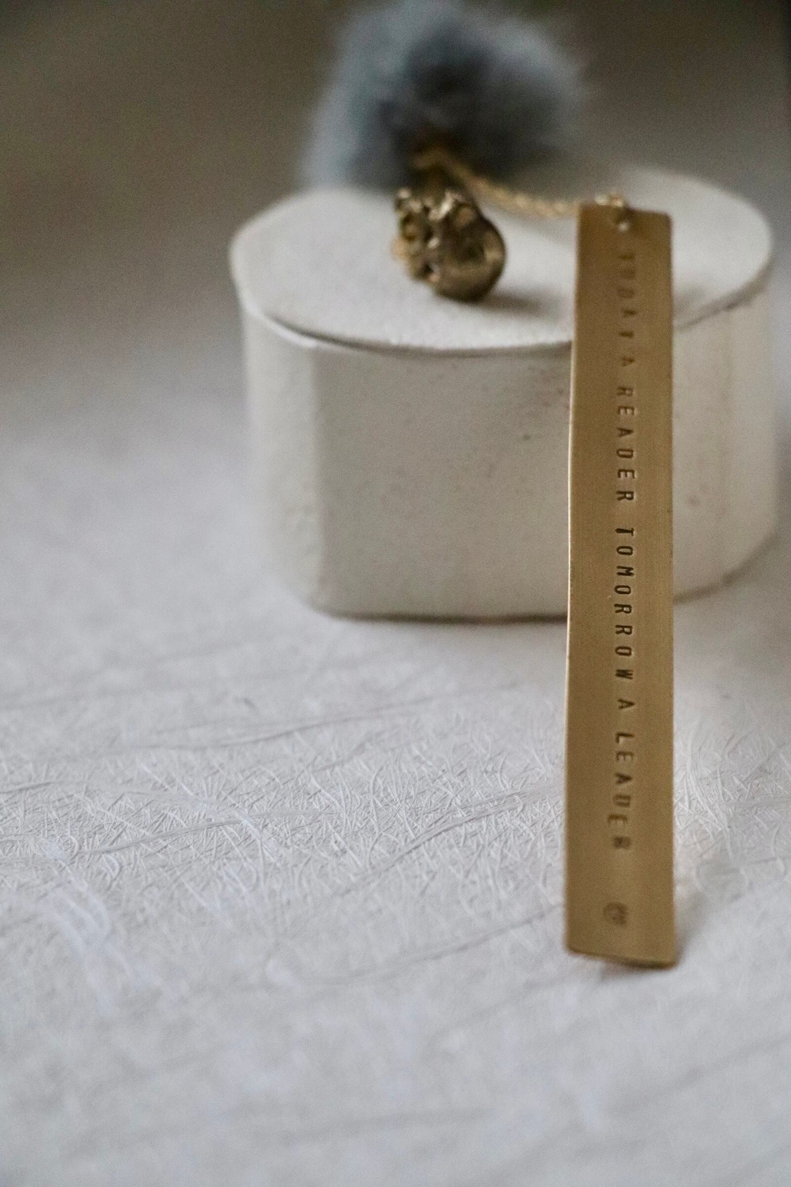 長い真鍮製のプレートには、「Today a reader tomorrow a leader(今日の読者は、明日のリーダーである)」の言葉を職人が手作業で一つひとつ刻印しました。この力強い言葉は、アメリカの思想家マーガレット・フラーの名言です。このしおりは、読書を通じて得た知識が、未来の可能性を広げる鍵となることを示唆します。