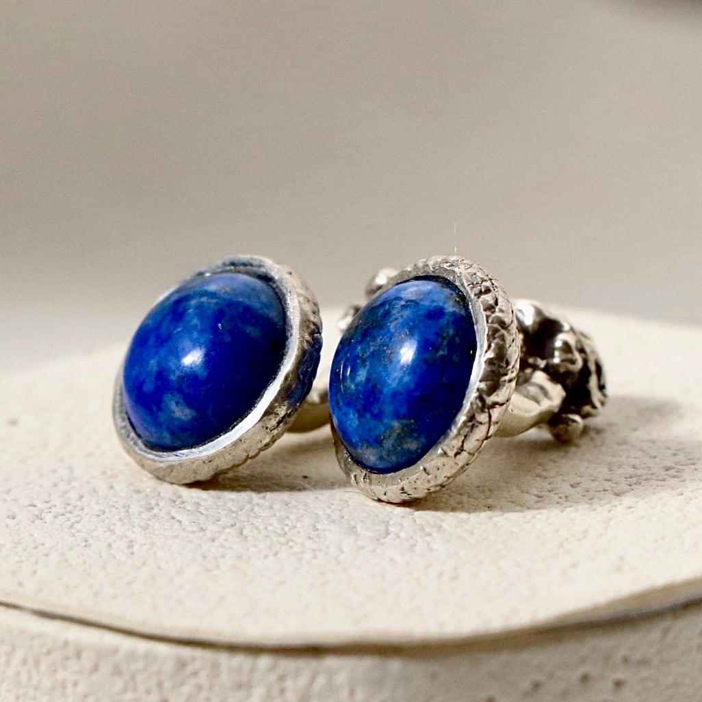 メインモチーフは、デニムラピスラズリ。特に美しい青を厳選し、アメリカから取り寄せた高品質なラピスラズリを、丸く磨き上げたカボションカットで仕上げました。深く鮮やかなブルーは、光の角度によって濃淡を変え、まるで深海や夜空のような神秘的な輝きを放ちます。ストーンの周囲は、丁寧に施されたロープのような**テクスチャーのベゼル(縁)**で囲まれ、クラシックな趣を添えています。