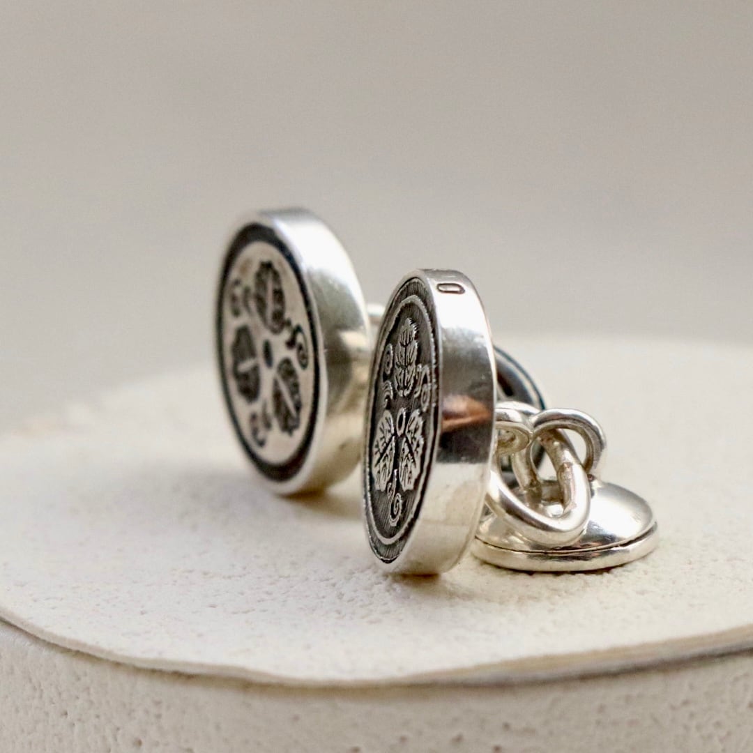 このカフリンクスは、日本の伝統的な「丸に蔓柏(つるがしわ)」の家紋をモチーフに、エレガントなチェーン式で仕上げた格調高い一品です。