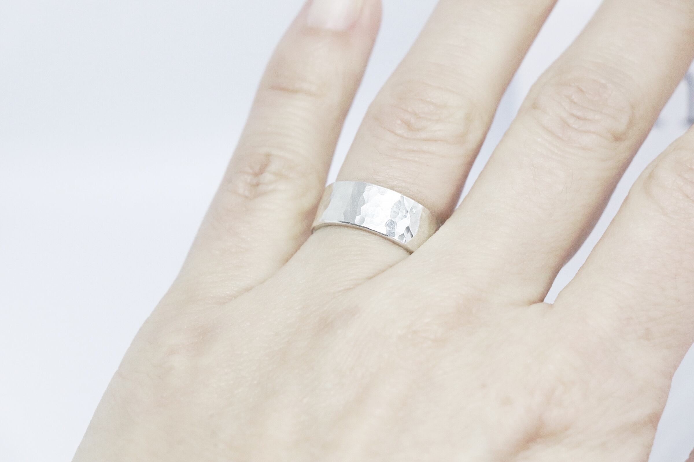 この指輪は槌目リングです。頭の丸い金槌で色んな面を作りました。光が反射するとキラキラ輝きます。