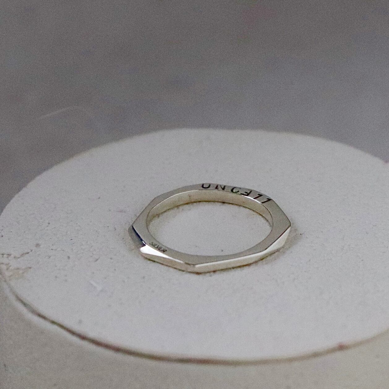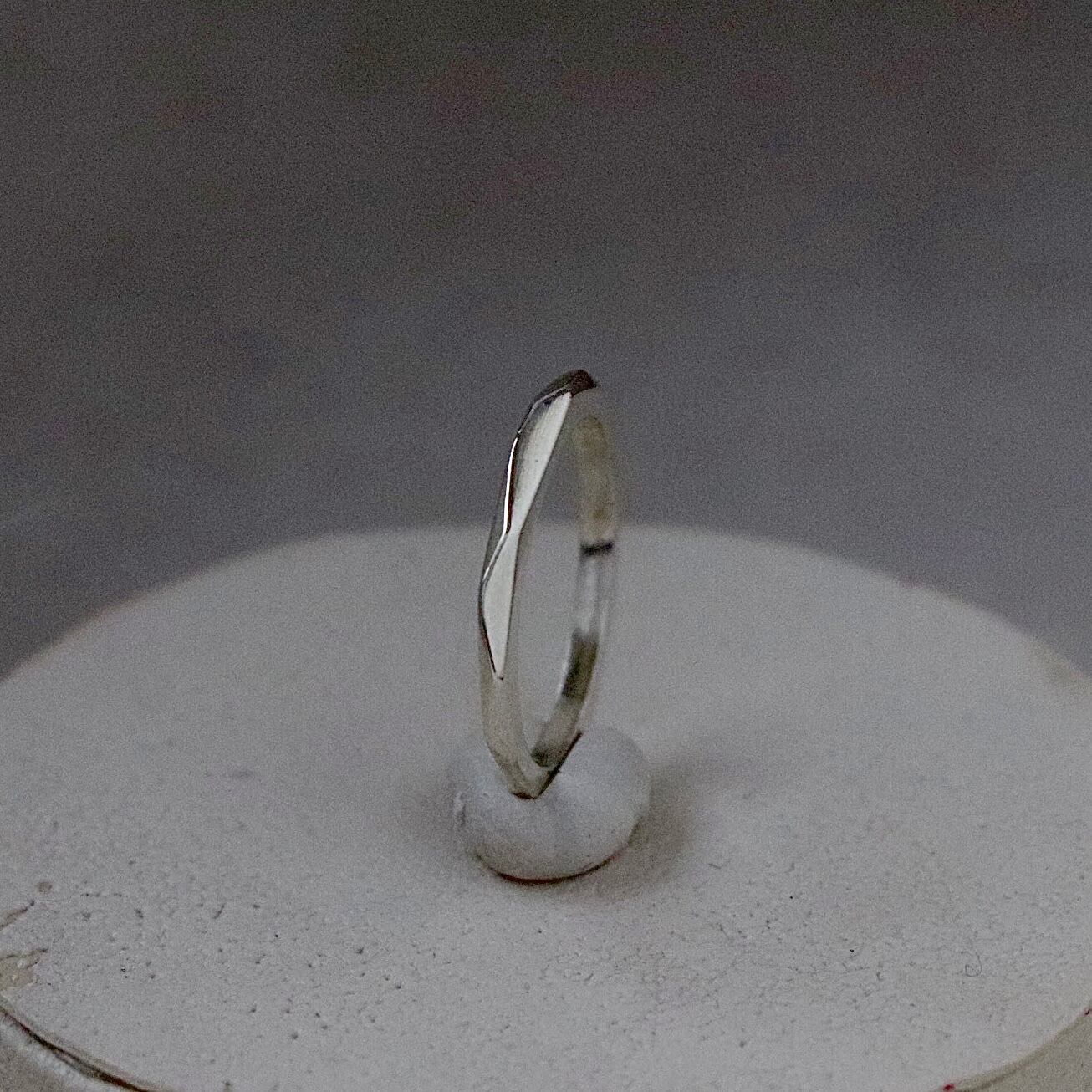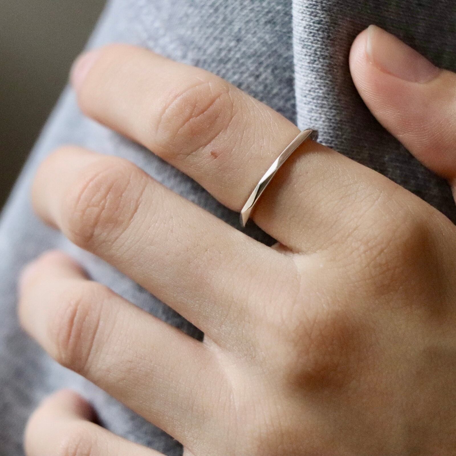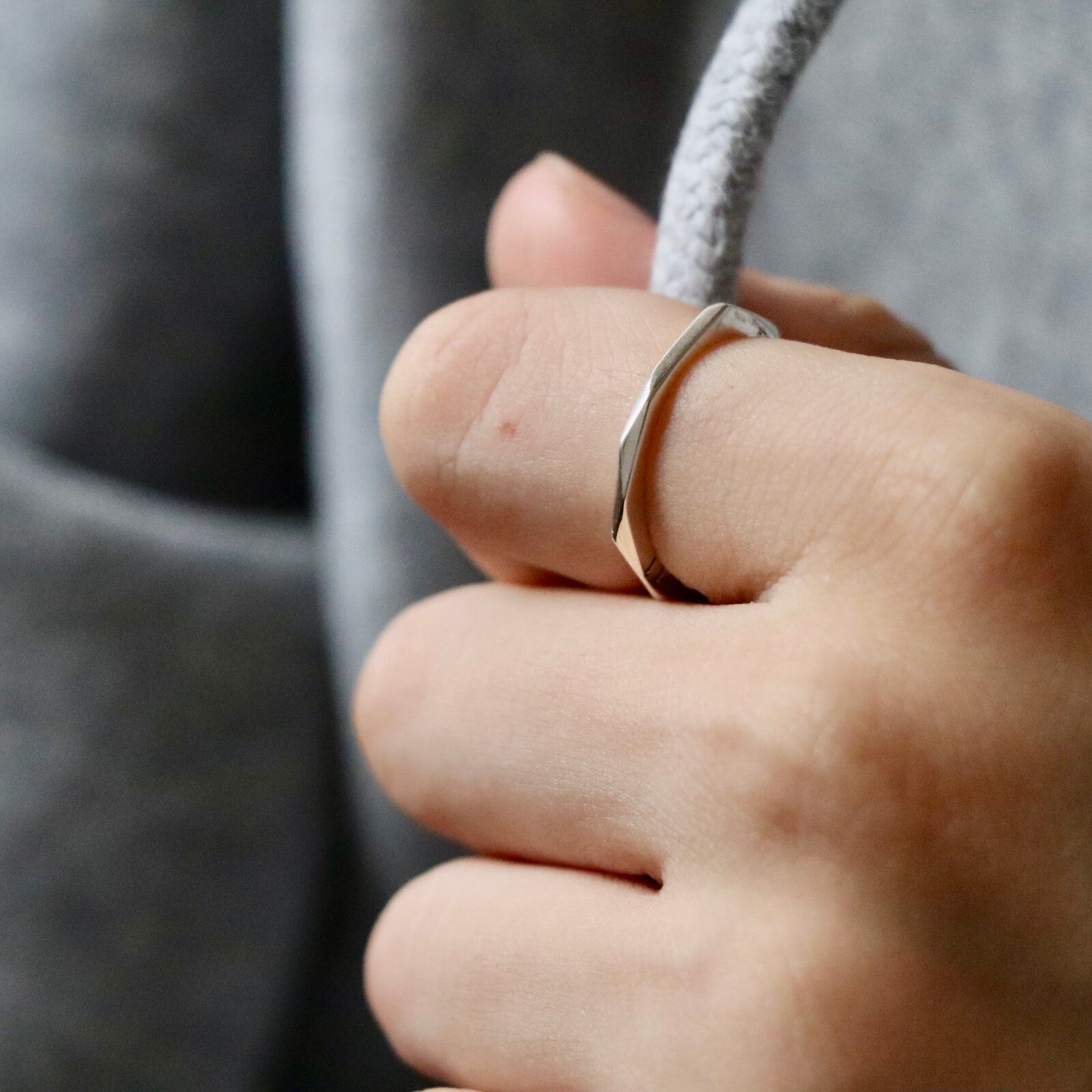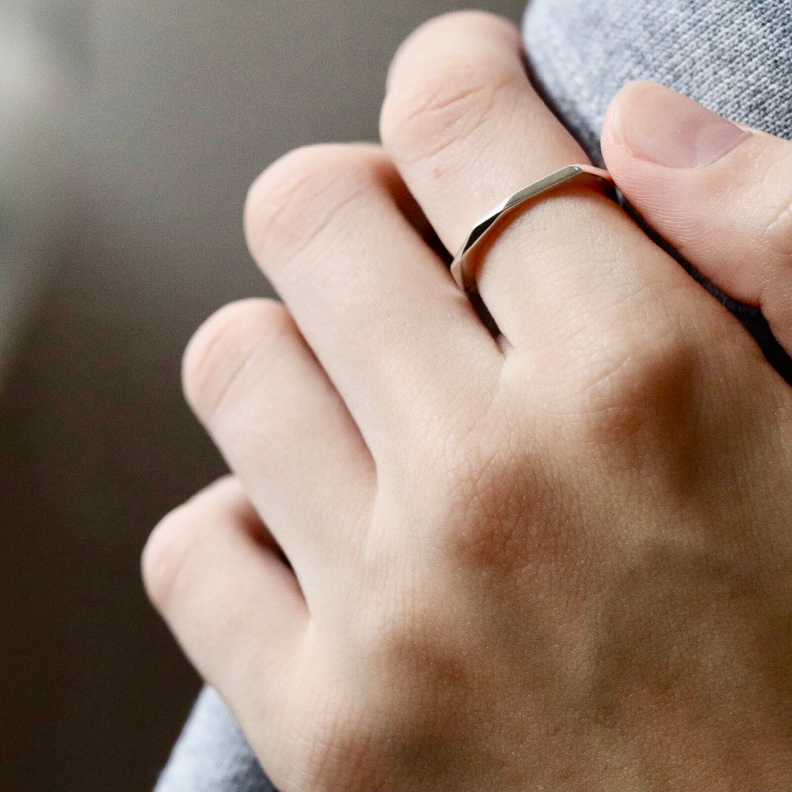 この指輪は色んなアングル(角度)が付いたリングです。槌目とは違って、金槌で叩いて仕上げるのではなく、ヤスリで面を作って仕上げていきます。色んな面があるので、光が反射するとキラキラ輝きます。