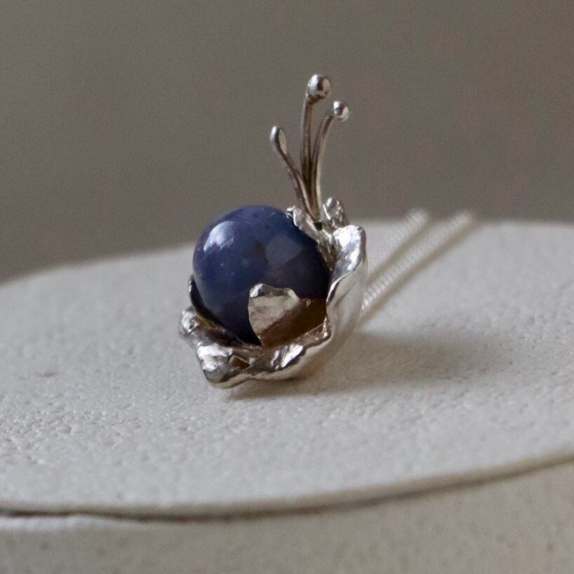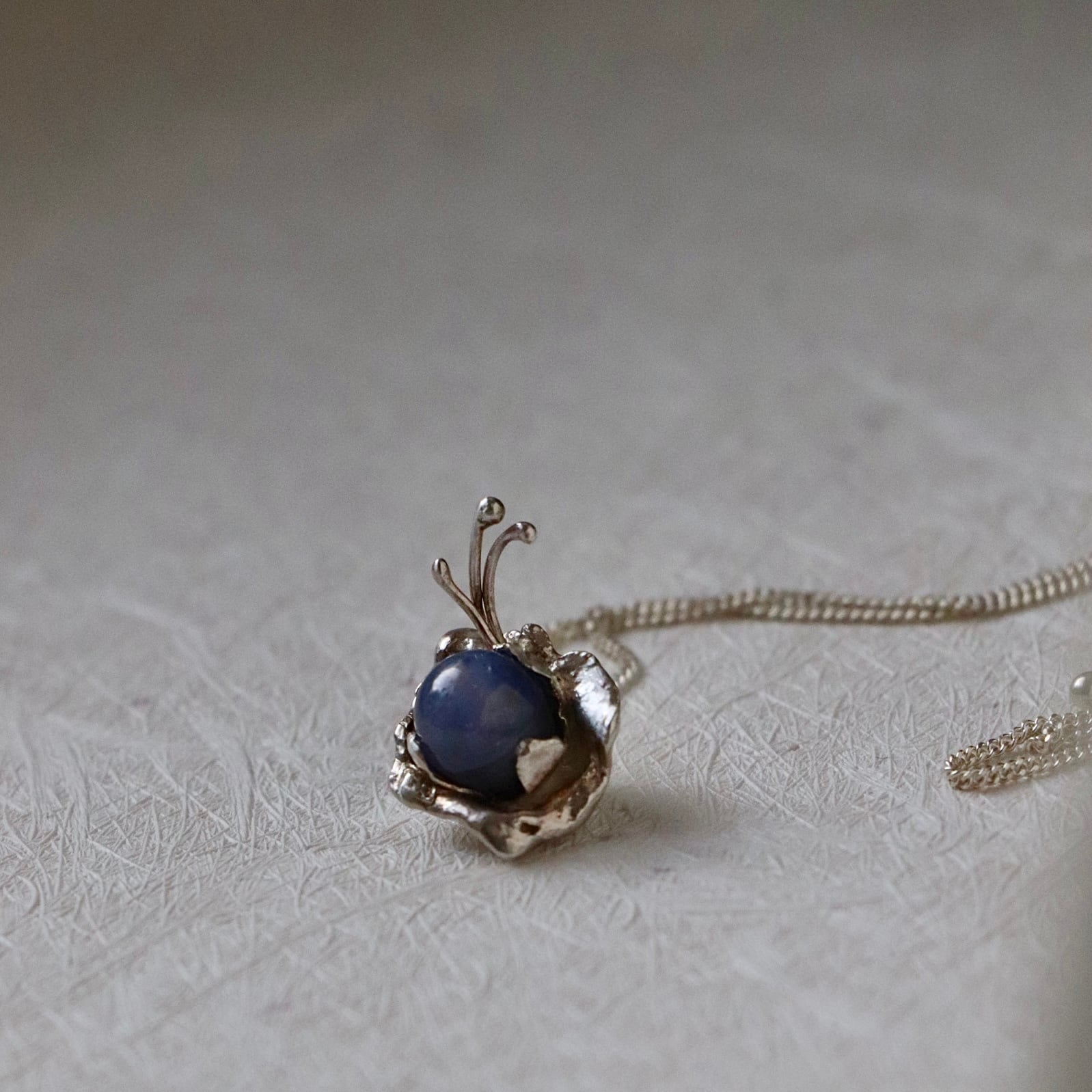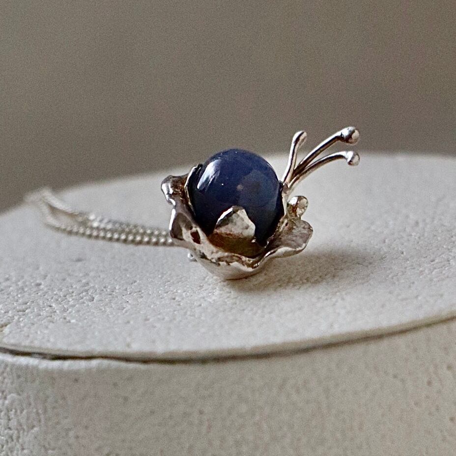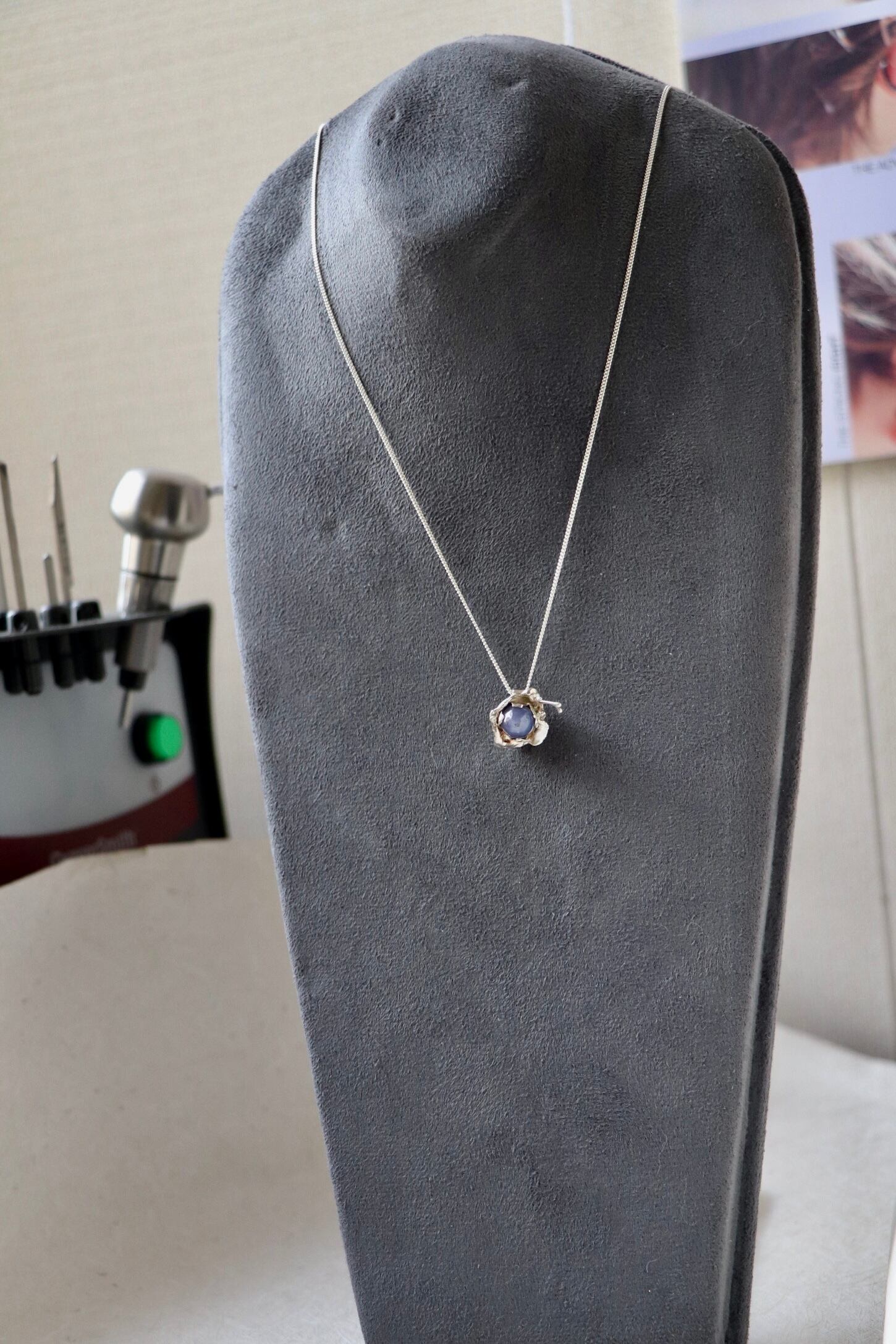 天然石の魅力は世界に一つしかない事。石は綺麗なスターサファイヤー。青紫っぽい淡くて優しい色です。光を当てると綺麗にスターの模様が見えます。
