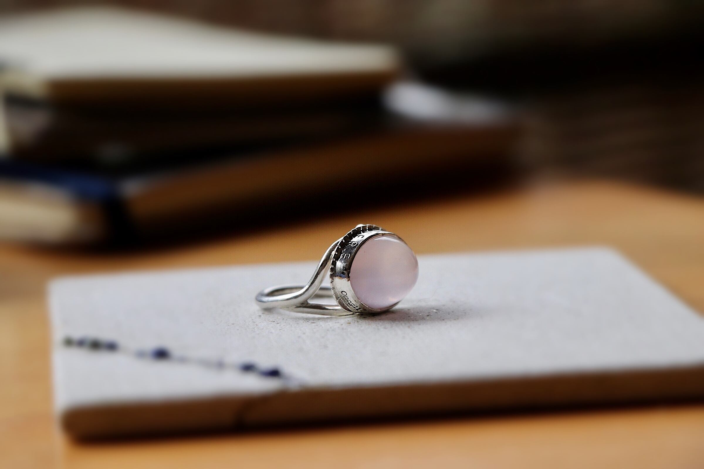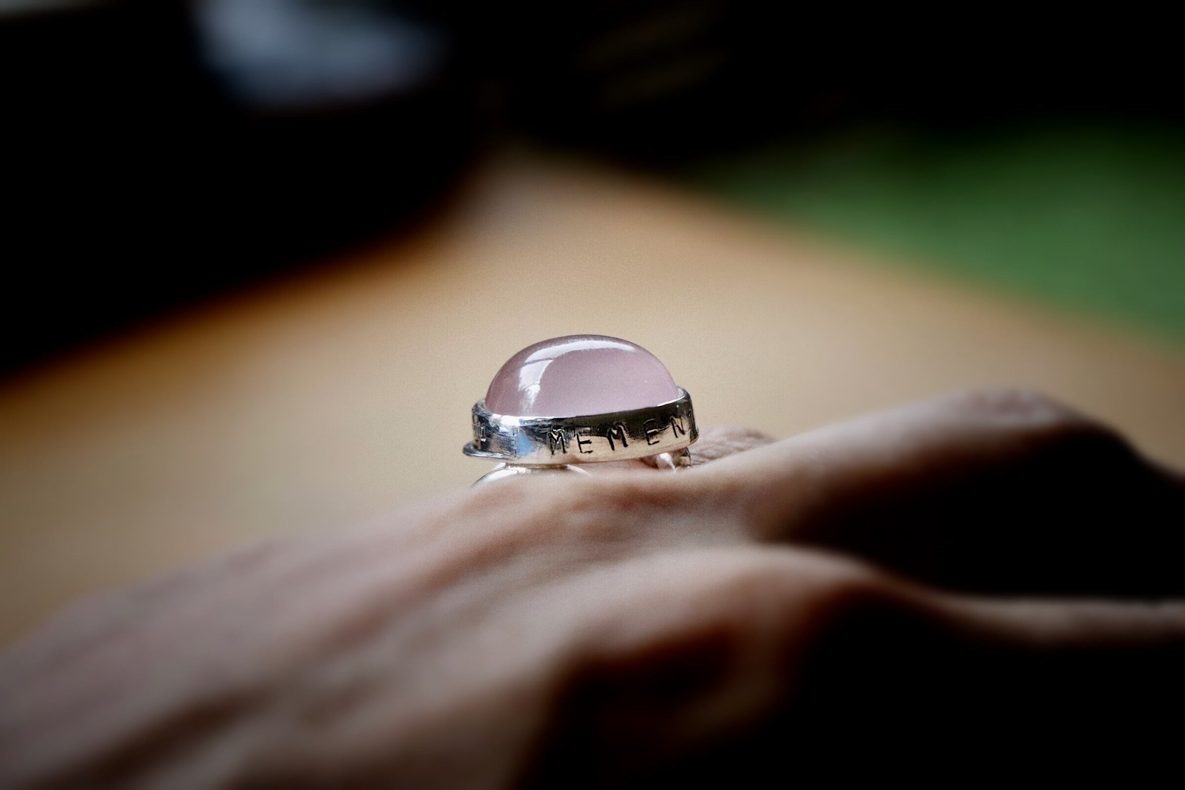 こちらの作品はピンクローズのクオーツの指輪です。ラテン語に指輪の覆輪の帯にメッセージを刻印しました。MEMENTO VIVERE : 今を生きろ