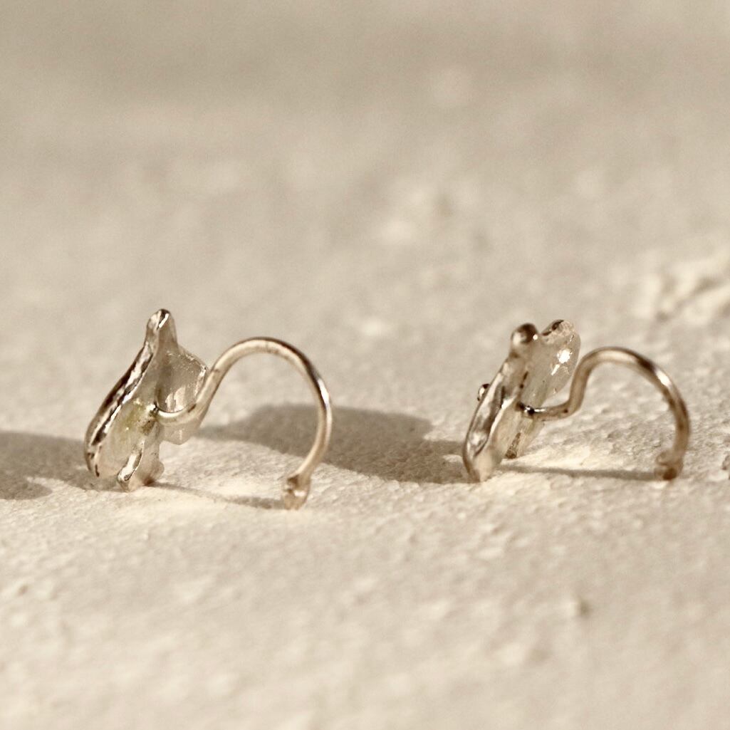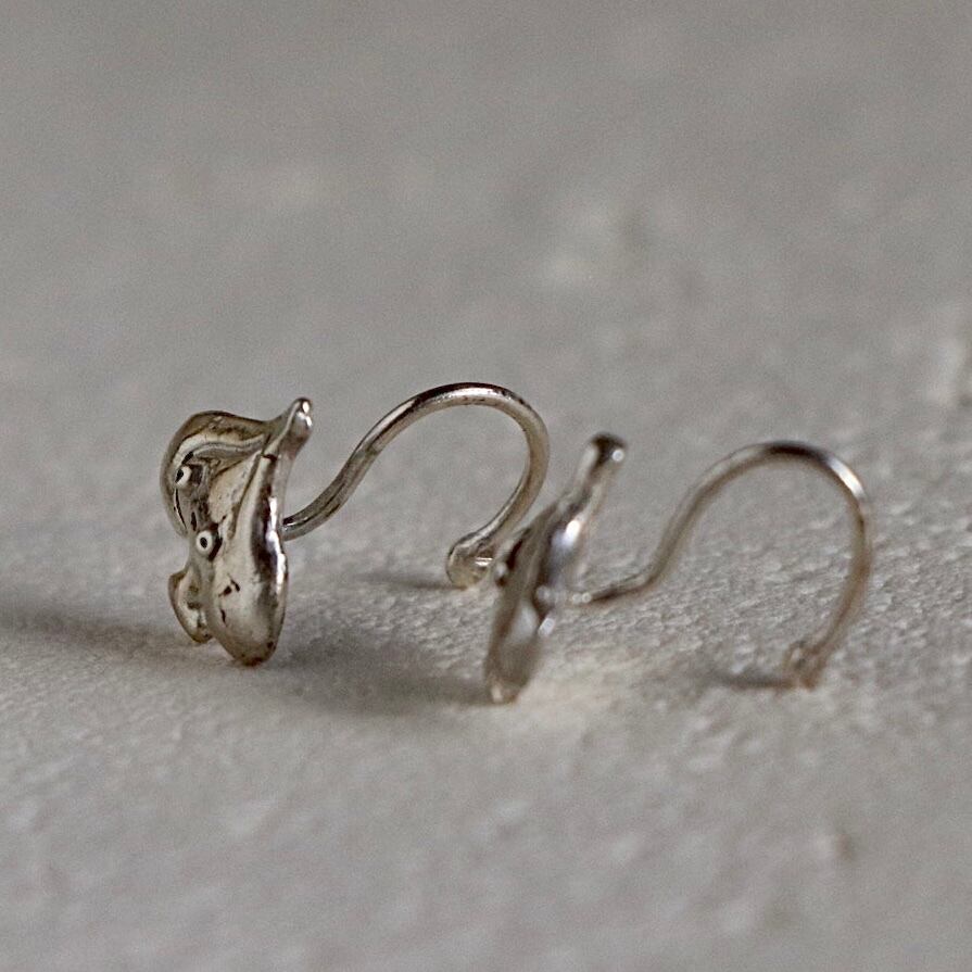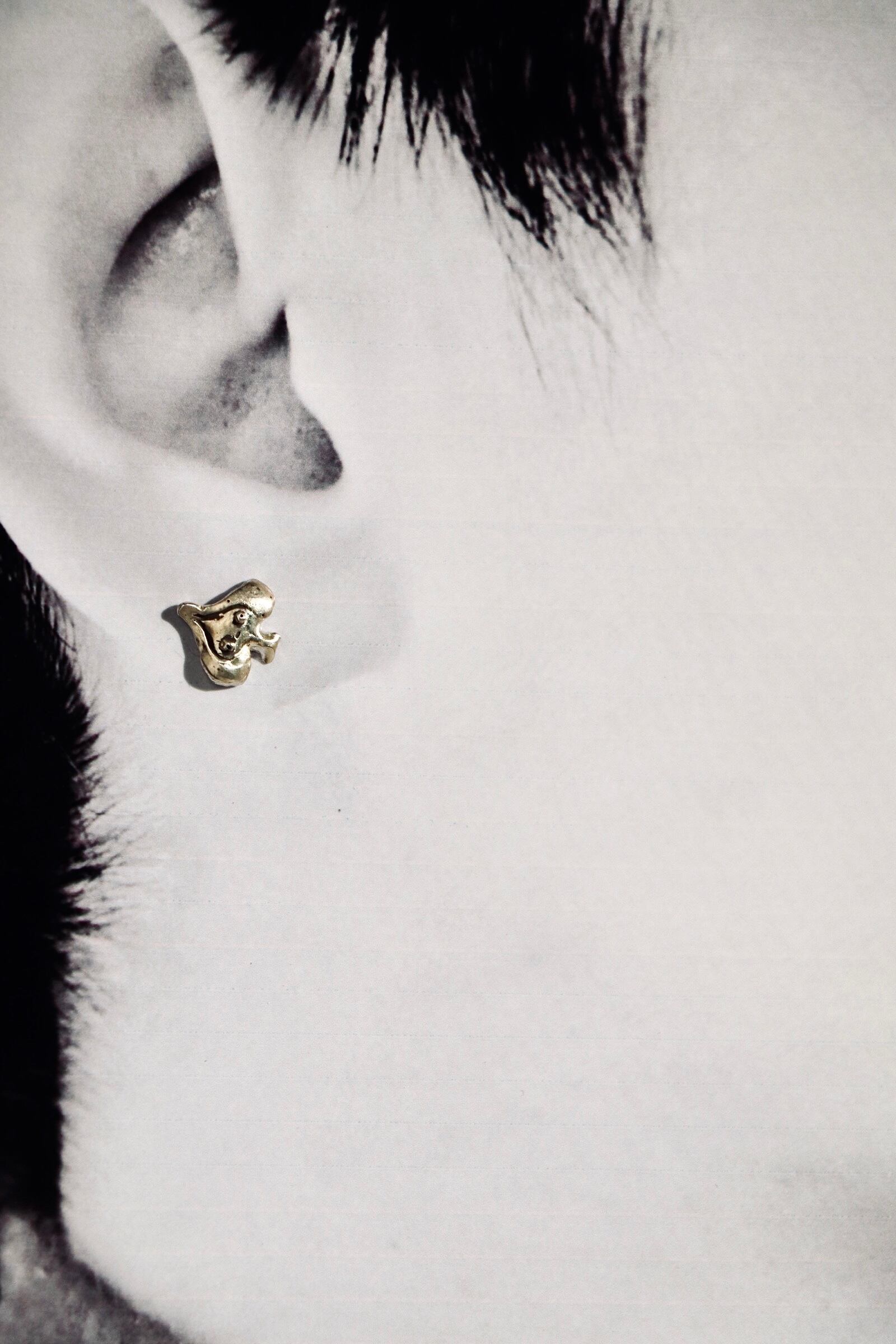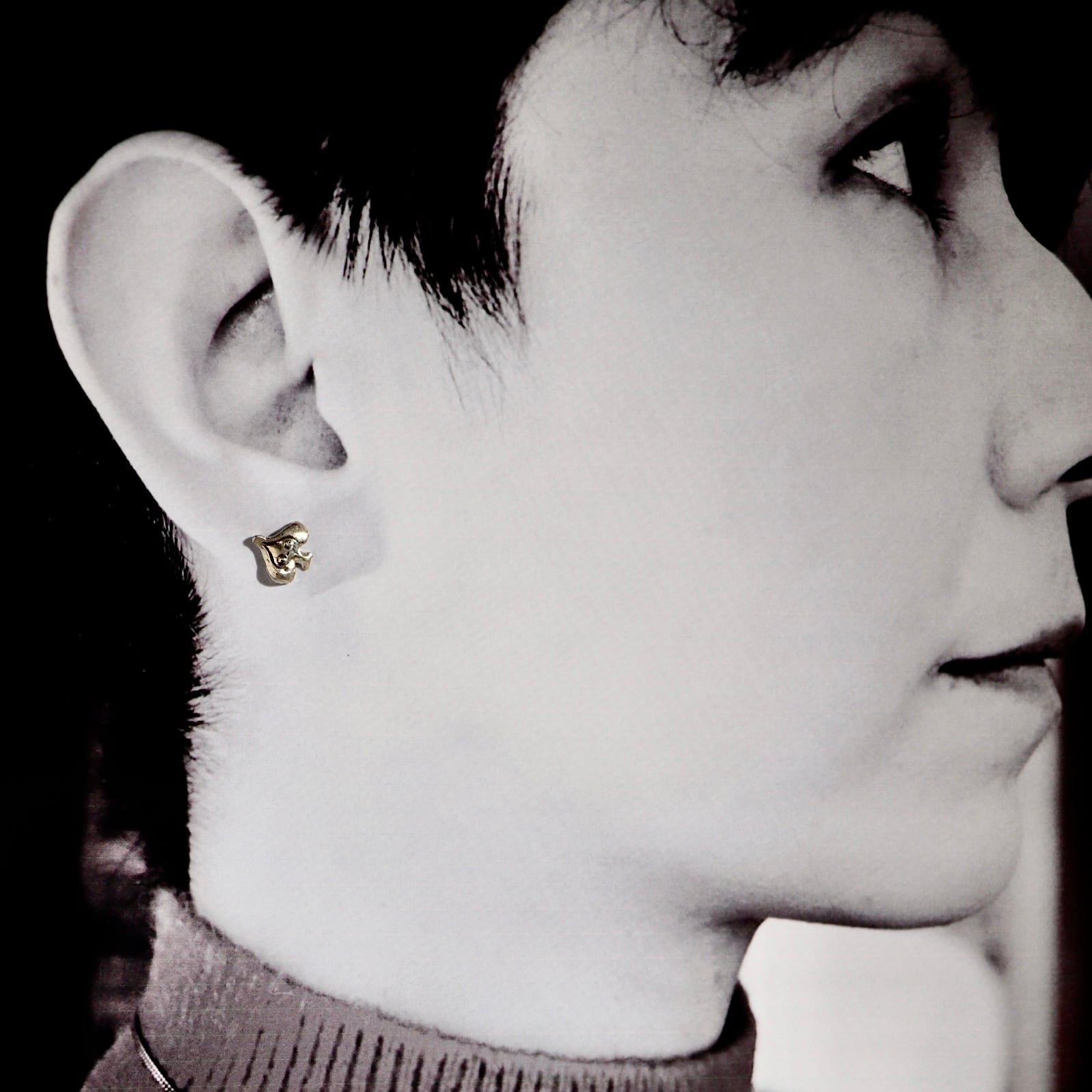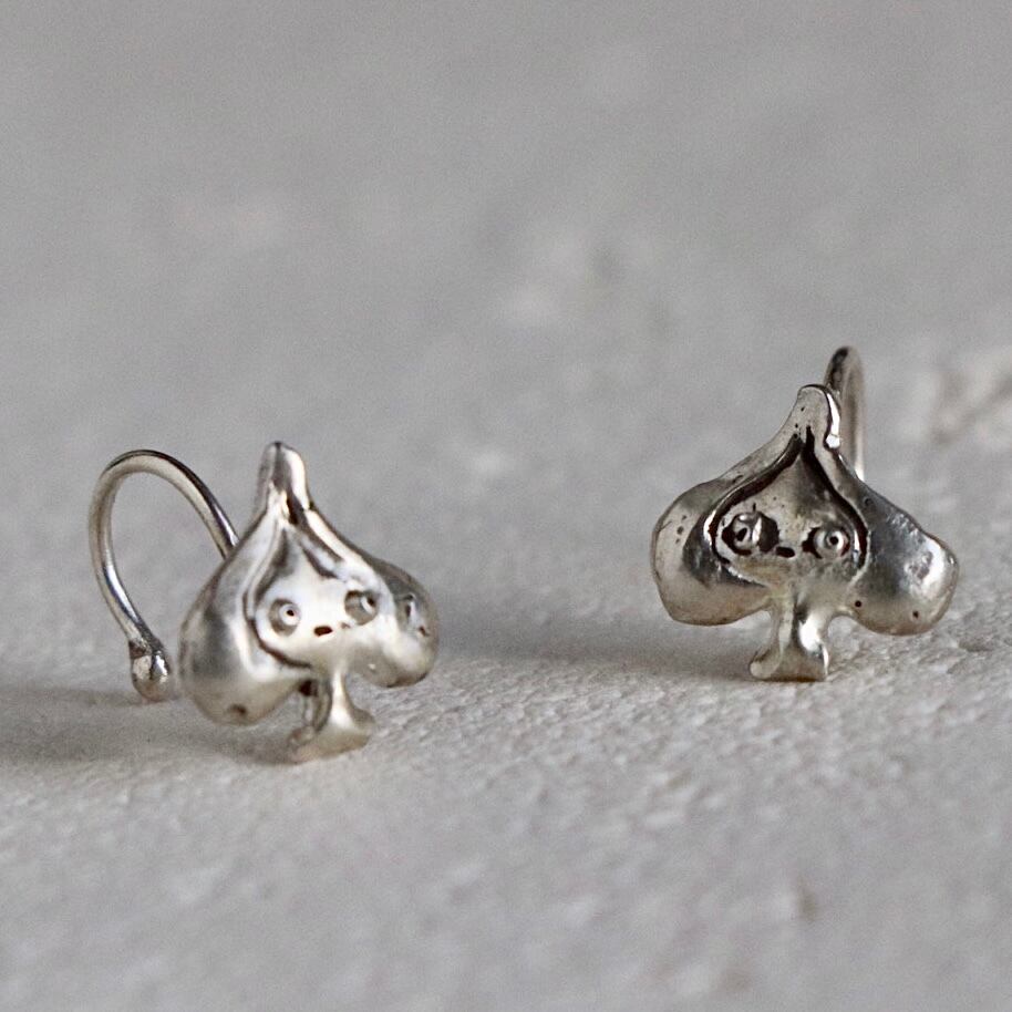こちらの作品は〈不思議の国アリスシリーズ> のトランプカードのミニ兵隊さん。スペード君の顔の部分だけになります。 ちょっと変わった形のピアスで後ろのポストなしで試着いただけます。耳たぶにピッタシ。軽くてつけやすいピアスになります。